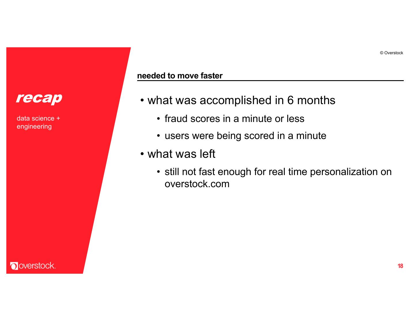 17 . © Overstock needed to move faster recap • what was accomplished in 6 months data science + • fraud scores in a minute or less engineering • users were being scored in a minute • what was left • still not fast enough for real time personalization on overstock.com 18
