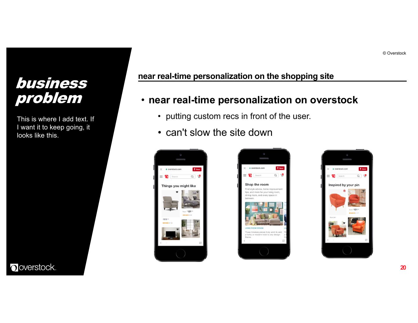 19 . © Overstock business near real-time personalization on the shopping site problem • near real-time personalization on overstock This is where I add text. If • putting custom recs in front of the user. I want it to keep going, it looks like this. • can't slow the site down 20