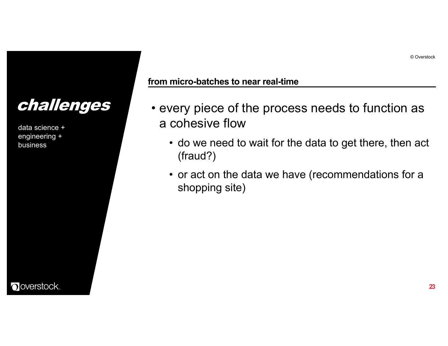22 . © Overstock from micro-batches to near real-time challenges • every piece of the process needs to function as data science + a cohesive flow engineering + business • do we need to wait for the data to get there, then act (fraud?) • or act on the data we have (recommendations for a shopping site) 23