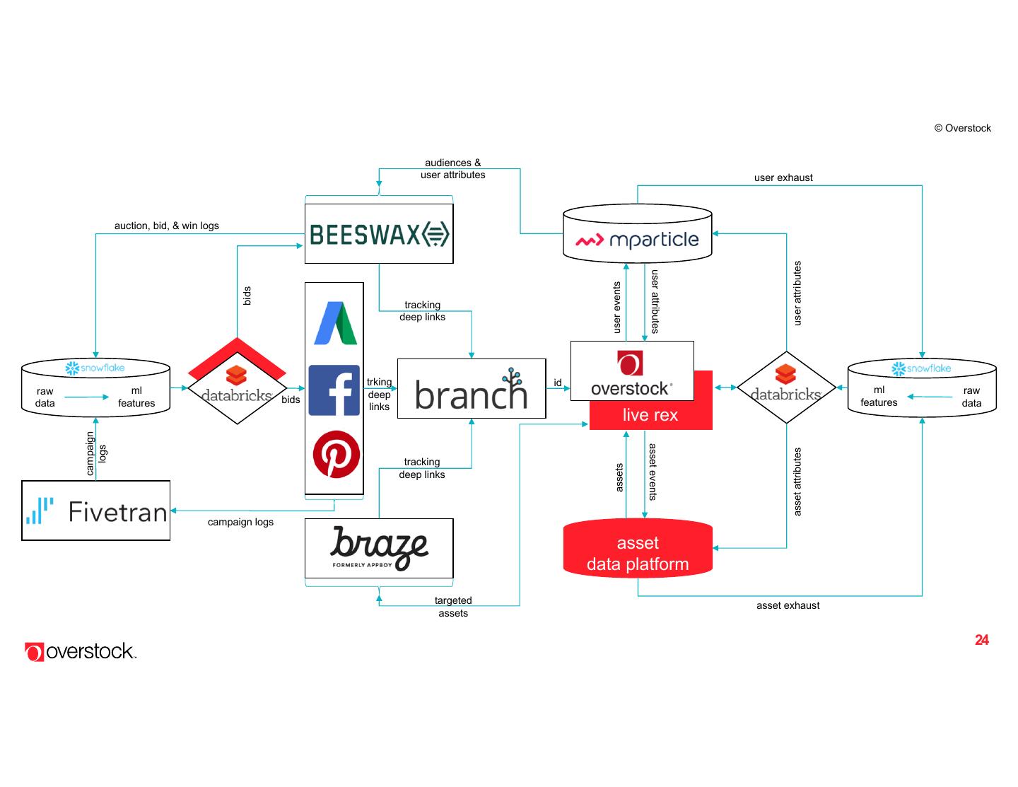 23 . © Overstock audiences & user attributes user exhaust auction, bid, & win logs user attributes user attributes user events bids tracking deep links pcm trking id raw ml deep ml raw data features bids features data links live rex campaign asset events logs asset attributes tracking assets deep links campaign logs asset data platform targeted asset exhaust assets 24