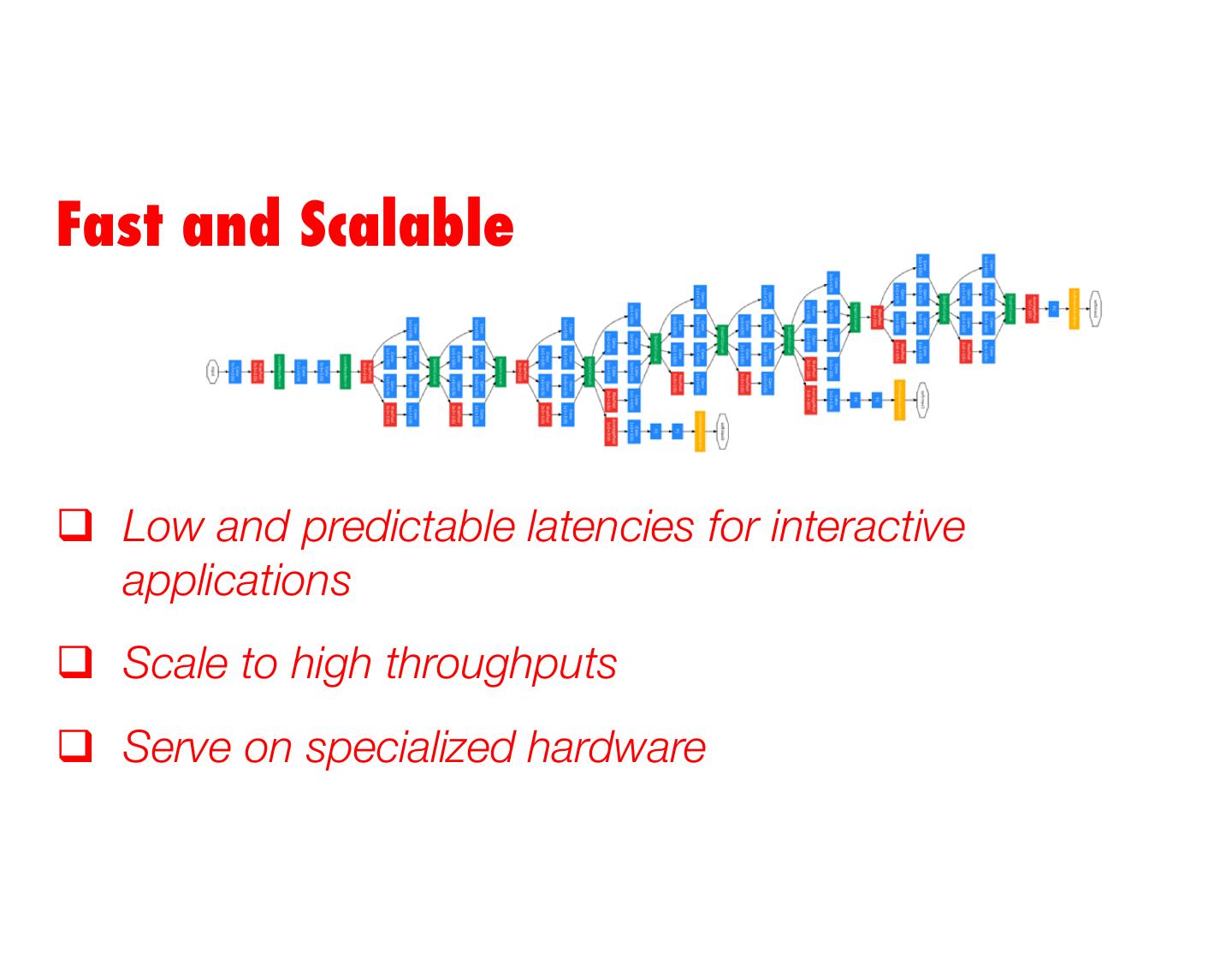 11 .Fast and Scalable q Low and predictable latencies for interactive applications q Scale to high throughputs q Serve on specialized hardware