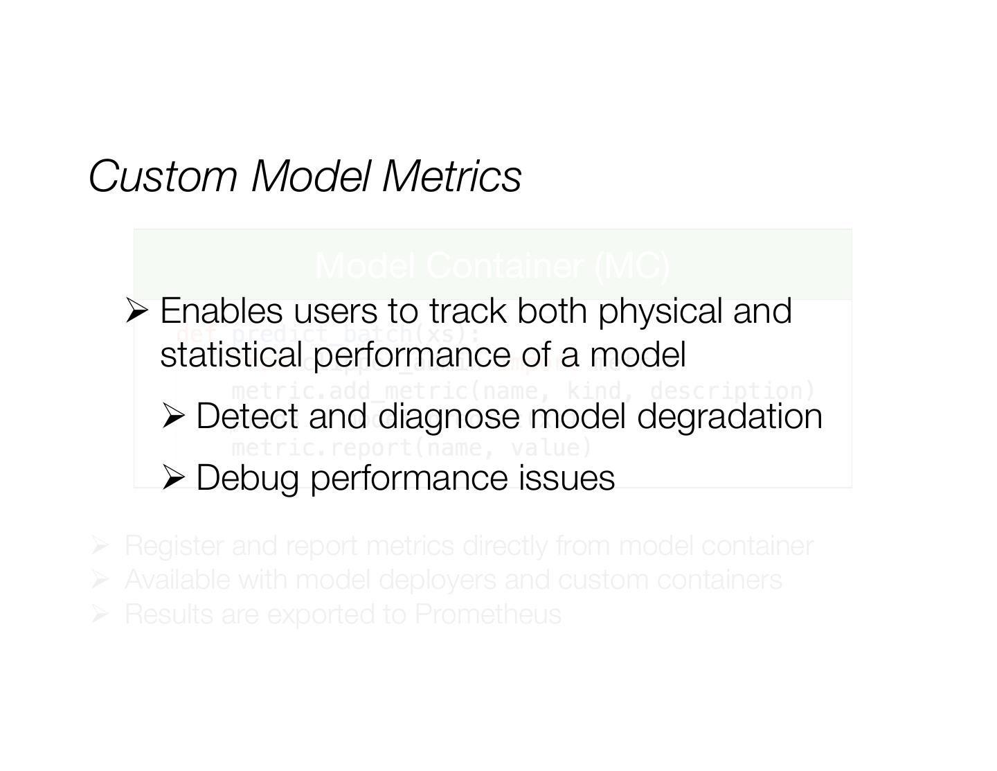 23 .Model in a Container Advantages: Ø General-purpose {REST API} Ø Renders predictions at serving time Query Problems: Decision Ø Requires data scientist to write performance-sensitive serving code Ø Inefficient use of compute resources à useApplication throughput- optimized frameworks to render single prediction Ø No support for monitoring or debugging models