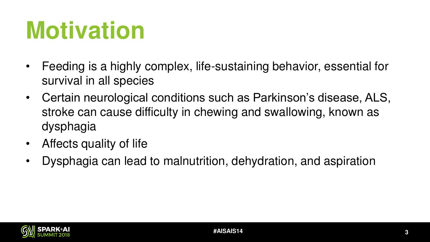 3 .Motivation • Feeding is a highly complex, life-sustaining behavior, essential for survival in all species • Certain neurological conditions such as Parkinson’s disease, ALS, stroke can cause difficulty in chewing and swallowing, known as dysphagia • Affects quality of life • Dysphagia can lead to malnutrition, dehydration, and aspiration #AISAIS14 3