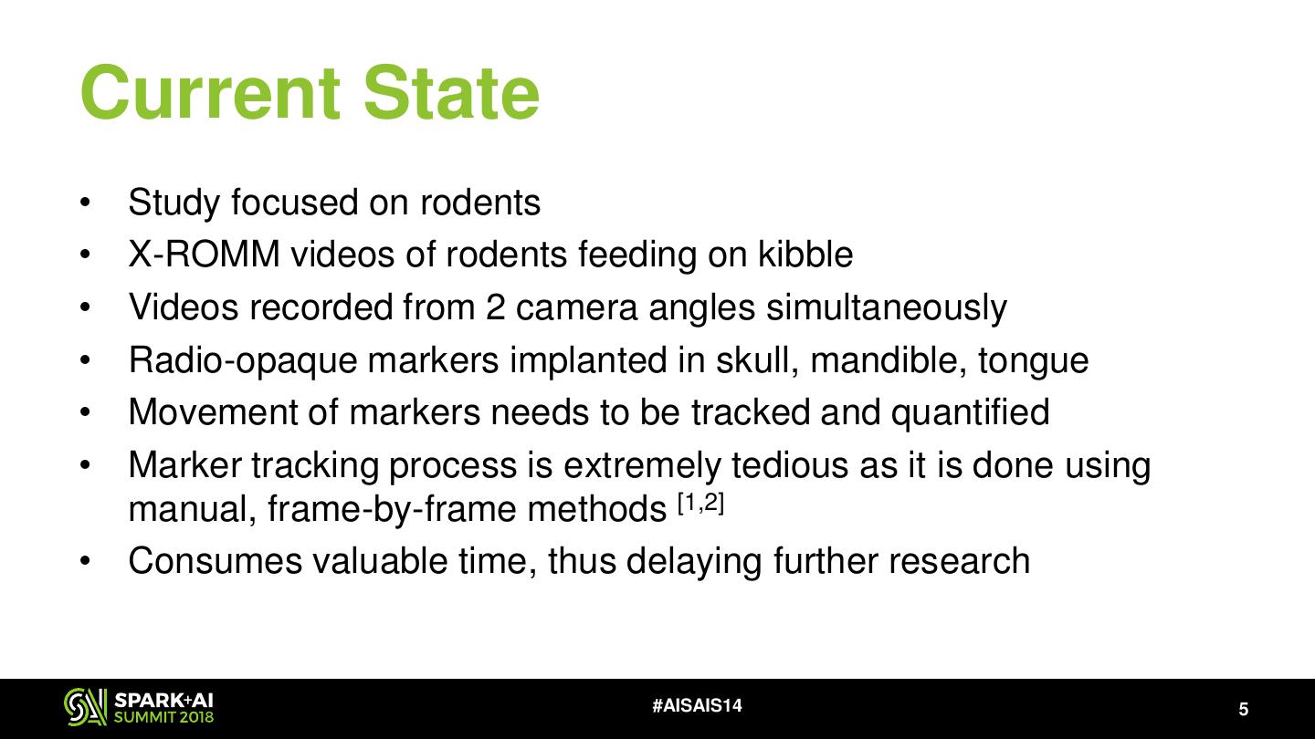 5 .Current State • Study focused on rodents • X-ROMM videos of rodents feeding on kibble • Videos recorded from 2 camera angles simultaneously • Radio-opaque markers implanted in skull, mandible, tongue • Movement of markers needs to be tracked and quantified • Marker tracking process is extremely tedious as it is done using manual, frame-by-frame methods [1,2] • Consumes valuable time, thus delaying further research #AISAIS14 5