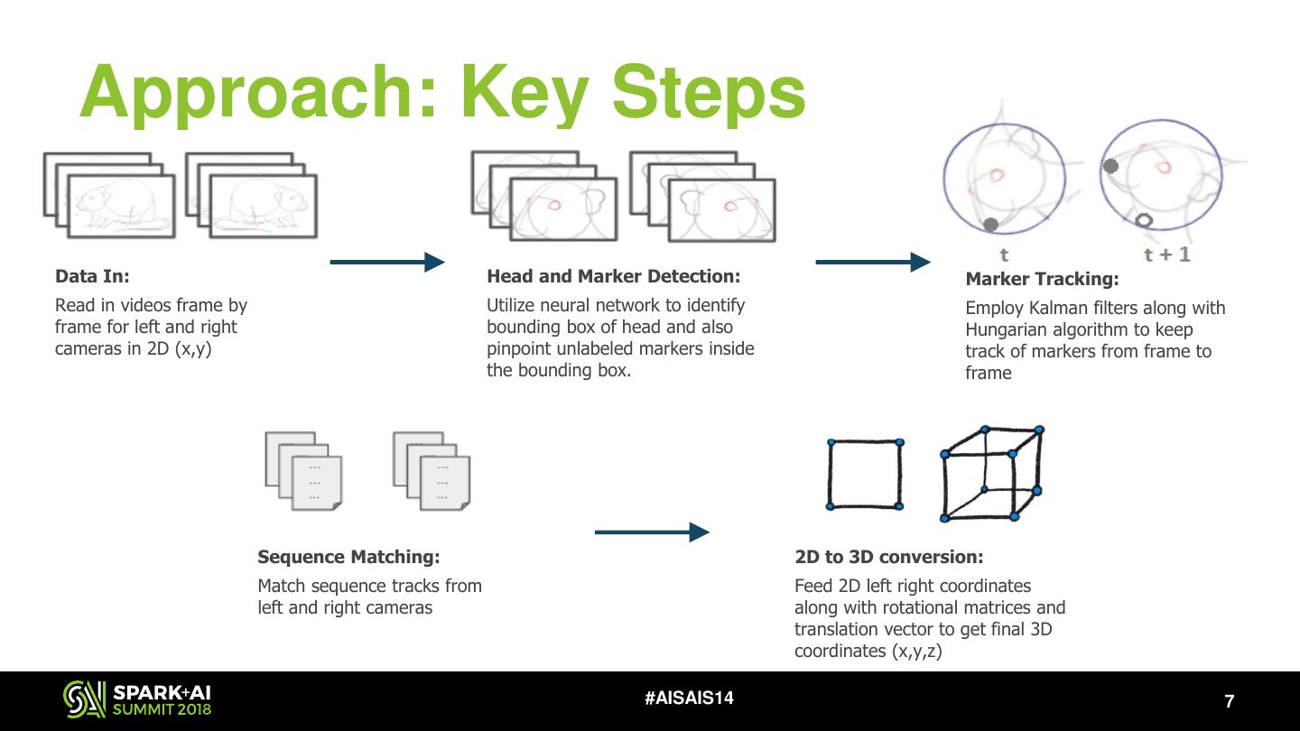 7 . Approach: Key Steps Data In: Head and Marker Detection: Marker Tracking: Read in videos frame by Utilize neural network to identify Employ Kalman filters along with frame for left and right bounding box of head and also Hungarian algorithm to keep cameras in 2D (x,y) pinpoint unlabeled markers inside track of markers from frame to the bounding box. frame Sequence Matching: 2D to 3D conversion: Match sequence tracks from Feed 2D left right coordinates left and right cameras along with rotational matrices and translation vector to get final 3D coordinates (x,y,z) #AISAIS14 7