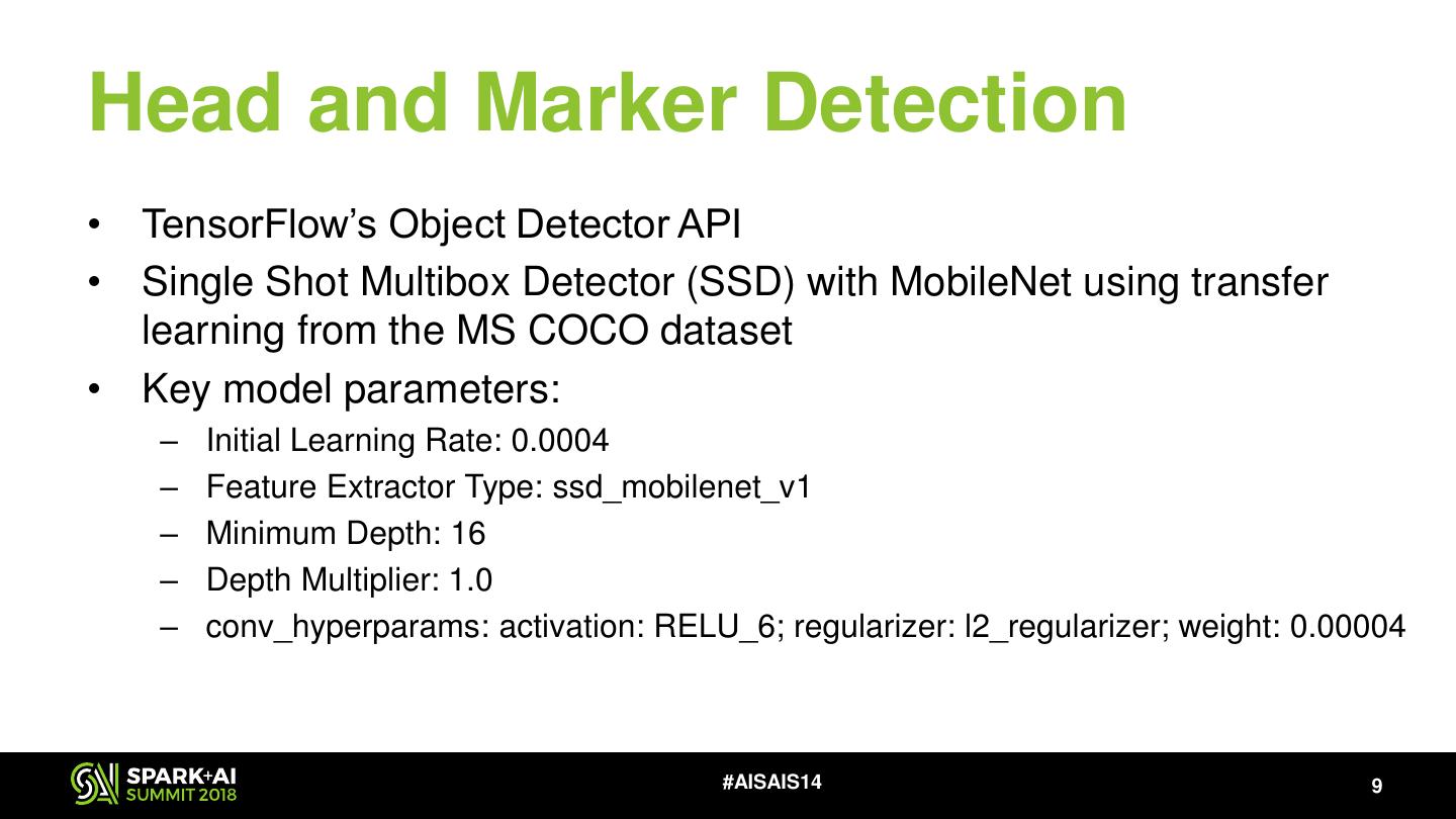 9 .Head and Marker Detection • TensorFlow’s Object Detector API • Single Shot Multibox Detector (SSD) with MobileNet using transfer learning from the MS COCO dataset • Key model parameters: – Initial Learning Rate: 0.0004 – Feature Extractor Type: ssd_mobilenet_v1 – Minimum Depth: 16 – Depth Multiplier: 1.0 – conv_hyperparams: activation: RELU_6; regularizer: l2_regularizer; weight: 0.00004 #AISAIS14 9