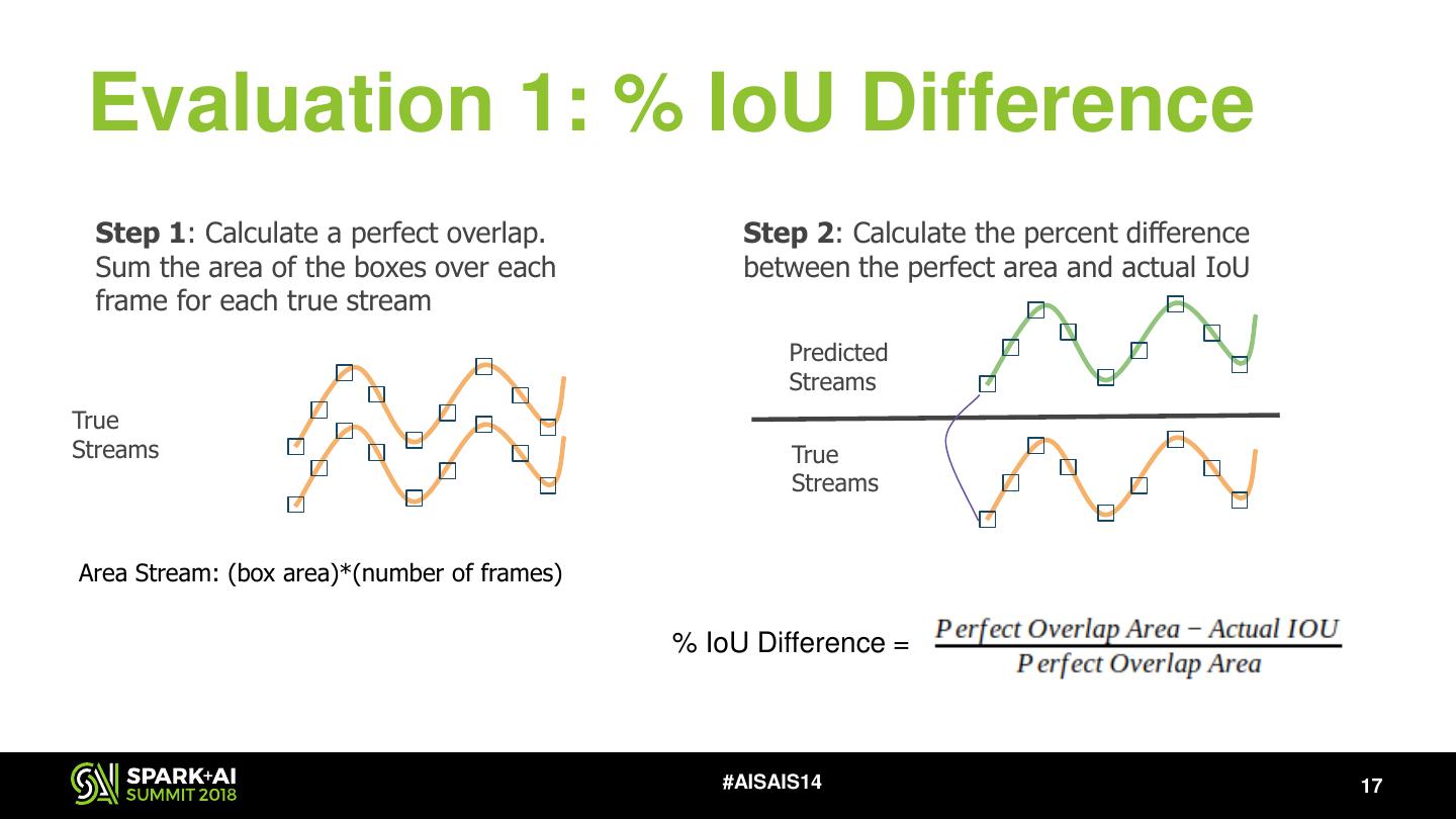 17 . Evaluation 1: % IoU Difference Step 1: Calculate a perfect overlap. Step 2: Calculate the percent difference Sum the area of the boxes over each between the perfect area and actual IoU frame for each true stream Predicted Streams True Streams True Streams Area Stream: (box area)*(number of frames) % IoU Difference = #AISAIS14 17
