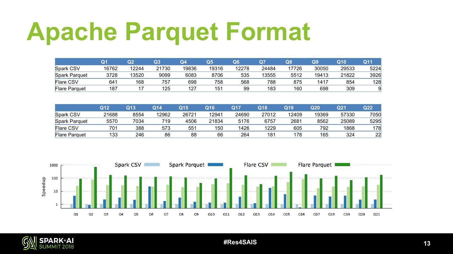 13 .Apache Parquet Format Q1 Q2 Q3 Q4 Q5 Q6 Q7 Q8 Q9 Q10 Q11 Spark CSV 16762 12244 21730 19836 19316 12278 24484 17726 30050 29533 5224 Spark Parquet 3728 13520 9099 6083 8706 535 13555 5512 19413 21822 3926 Flare CSV 641 168 757 698 758 568 788 875 1417 854 128 Flare Parquet 187 17 125 127 151 99 183 160 698 309 9 Q12 Q13 Q14 Q15 Q16 Q17 Q18 Q19 Q20 Q21 Q22 Spark CSV 21688 8554 12962 26721 12941 24690 27012 12409 19369 57330 7050 Spark Parquet 5570 7034 719 4506 21834 5176 6757 2681 8562 25089 5295 Flare CSV 701 388 573 551 150 1426 1229 605 792 1868 178 Flare Parquet 133 246 86 88 66 264 181 178 165 324 22 #Res4SAIS 13