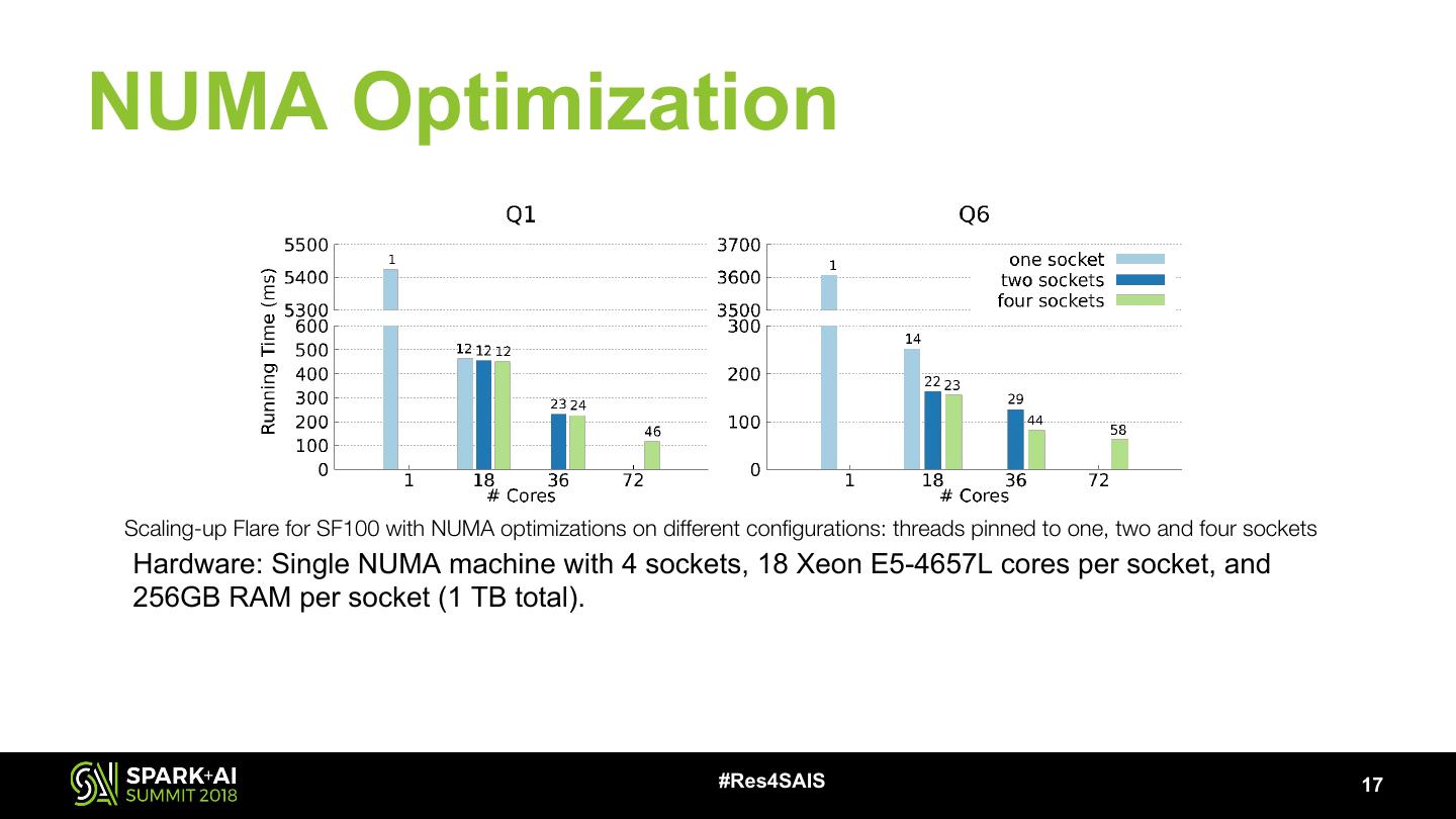 17 .NUMA Optimization Scaling-up Flare for SF100 with NUMA optimizations on different configurations: threads pinned to one, two and four sockets Hardware: Single NUMA machine with 4 sockets, 18 Xeon E5-4657L cores per socket, and 256GB RAM per socket (1 TB total). #Res4SAIS 17