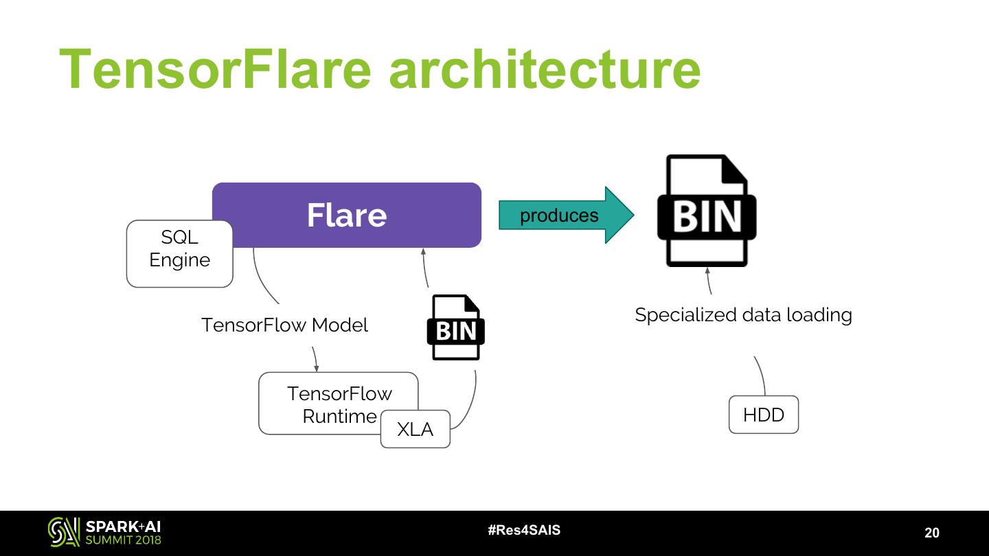20 .TensorFlare architecture Flare produces SQL Engine Specialized data loading TensorFlow Model TensorFlow Runtime HDD XLA #Res4SAIS 20