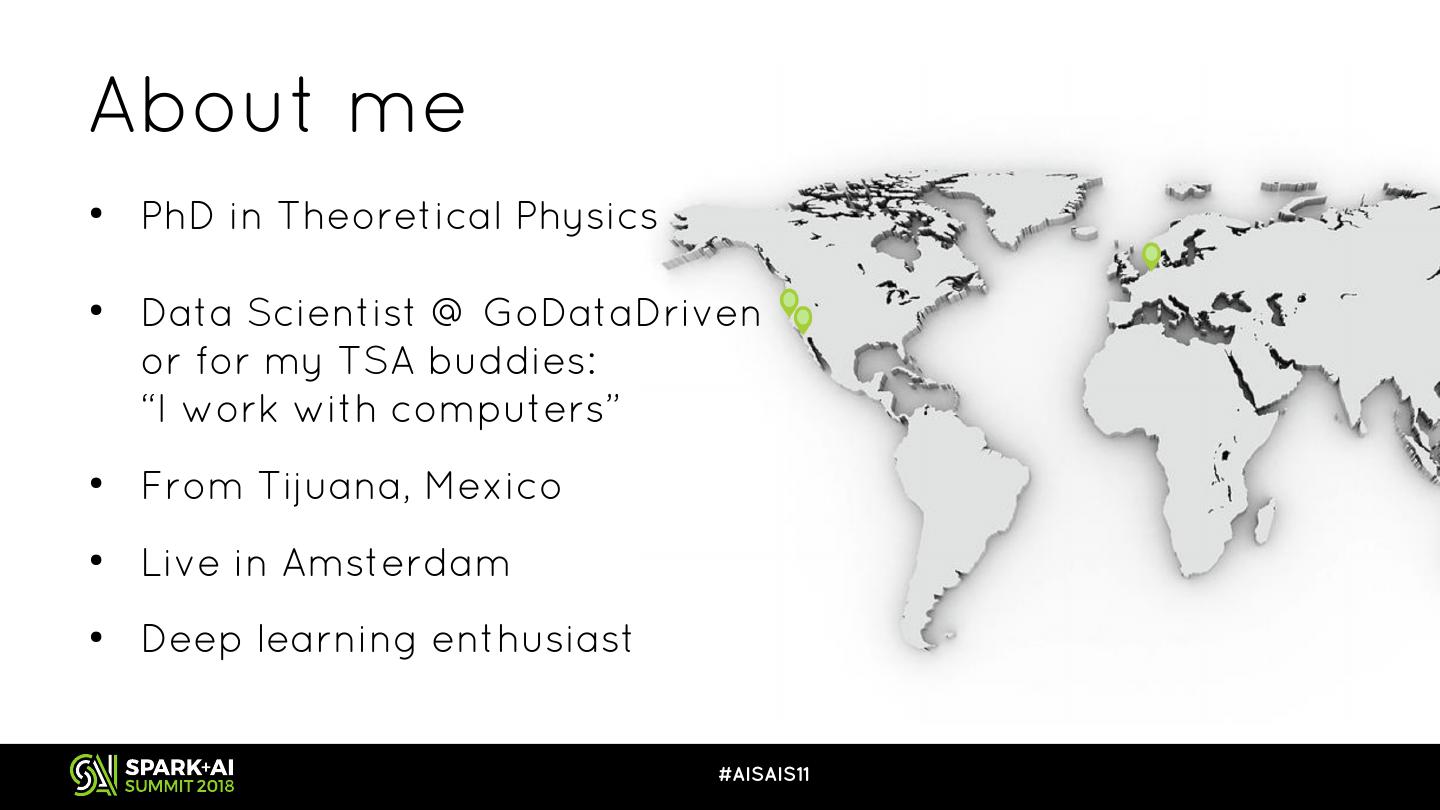 2 .About me ● PhD in Theoretical Physics ● Data Scientist @ GoDataDriven or for my TSA buddies: “I work with computers” ● From Tijuana, Mexico ● Live in Amsterdam ● Deep learning enthusiast #AISAIS11