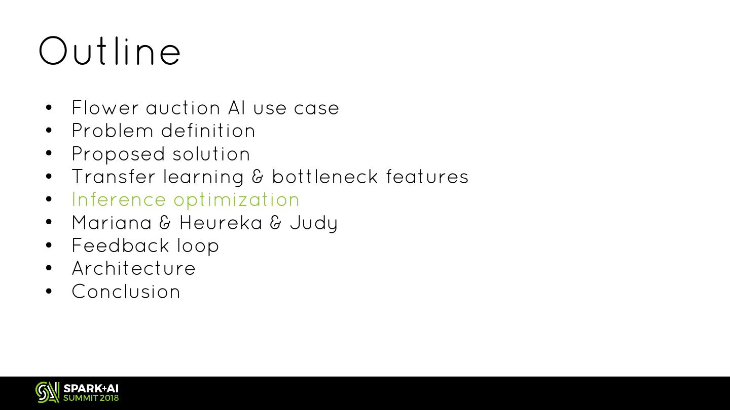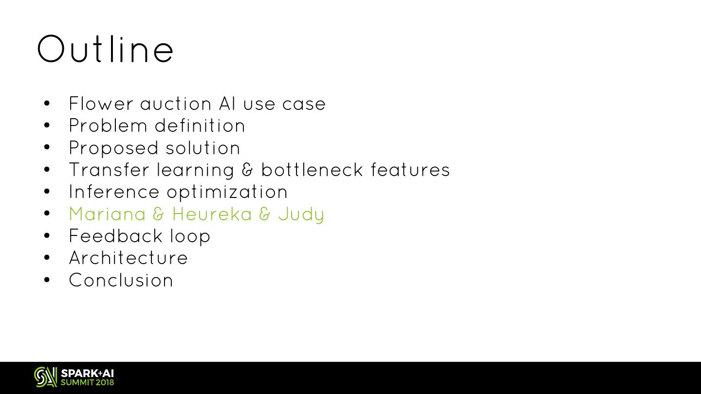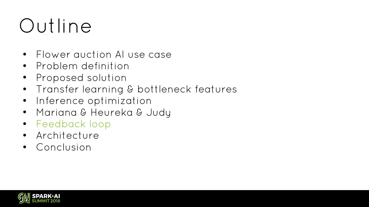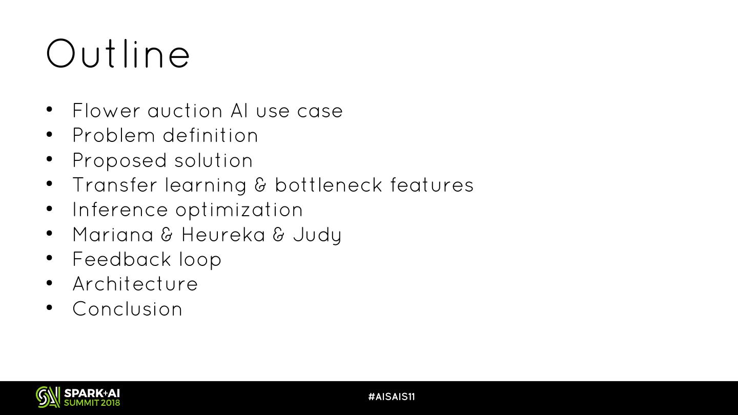24 .Outline ● Flower auction AI use case ● Problem definition ● Proposed solution ● Transfer learning & bottleneck features ● Inference optimization ● Mariana & Heureka & Judy ● Feedback loop ● Architecture ● Conclusion #AISAIS11