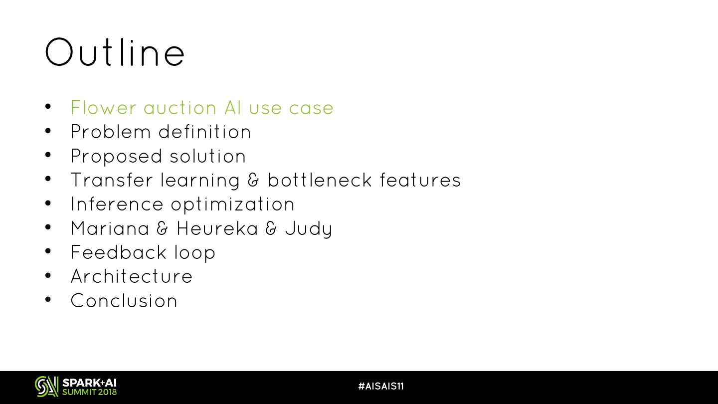 4 .Outline ● Flower auction AI use case ● Problem definition ● Proposed solution ● Transfer learning & bottleneck features ● Inference optimization ● Mariana & Heureka & Judy ● Feedback loop ● Architecture ● Conclusion #AISAIS11