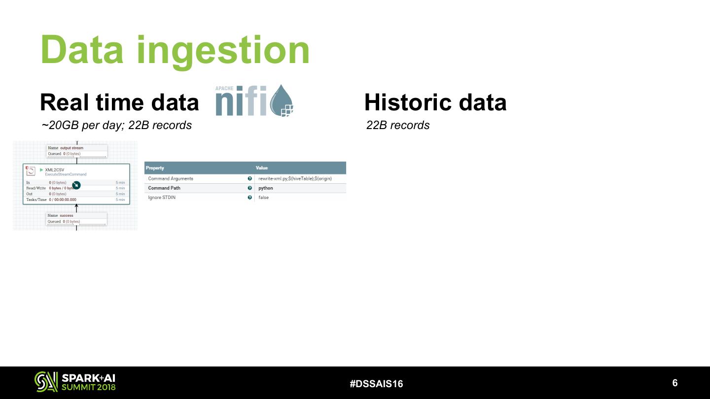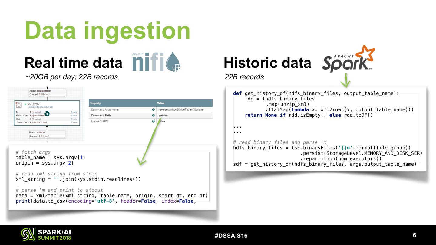 15 . Data ingestion Real time data Historic data ~20GB per day; 22B records 22B records def get_history_df(hdfs_binary_files, output_table_name): rdd = (hdfs_binary_files .map(unzip_xml) .flatMap(lambda x: xml2rows(x, output_table_name))) return None if rdd.isEmpty() else rdd.toDF() ... ... # read binary files and parse 'm hdfs_binary_files = (sc.binaryFiles('{}*'.format(file_group)) # fetch args .persist(StorageLevel.MEMORY_AND_DISK_SER) table_name = sys.argv[1] .repartition(num_executors)) origin = sys.argv[2] sdf = get_history_df(hdfs_binary_files, args.output_table_name) # read xml string from stdin xml_string = ''.join(sys.stdin.readlines()) # parse 'm and print to stdout data = xml2table(xml_string, table_name, origin, start_dt, end_dt) >> Better suited for large datasets print(data.to_csv(encoding='utf-8', header=False, index=False, >> Easier to (re)partition and append >> Preference for a unified approach #DSSAIS16 !6