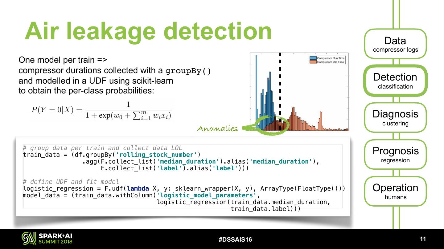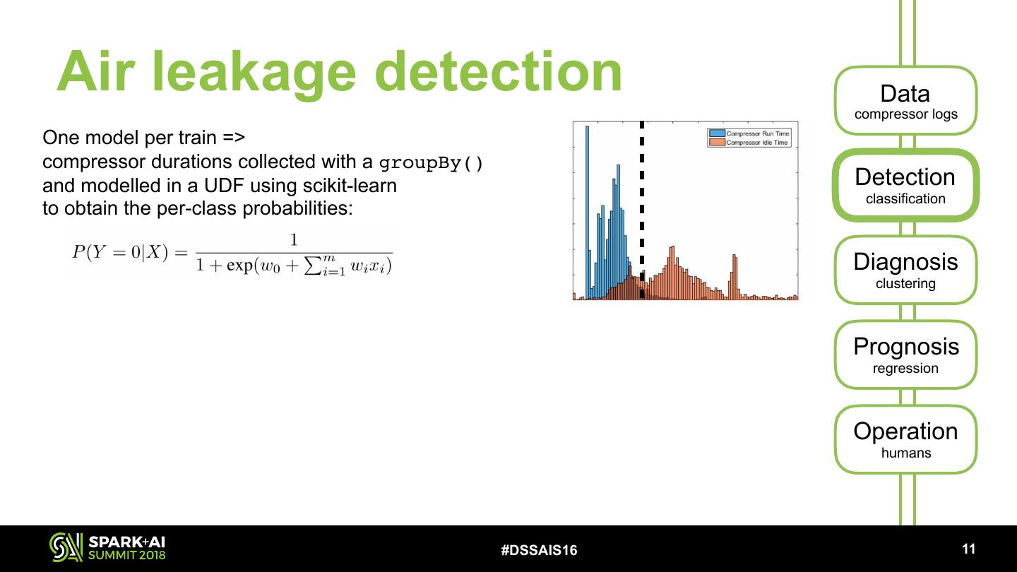 20 . Air leakage detection Data compressor logs One model per train => compressor durations collected with a groupBy() and modelled in a UDF using scikit-learn Detection classification to obtain the per-class probabilities: Diagnosis clustering Prognosis regression Operation humans #DSSAIS16 !11