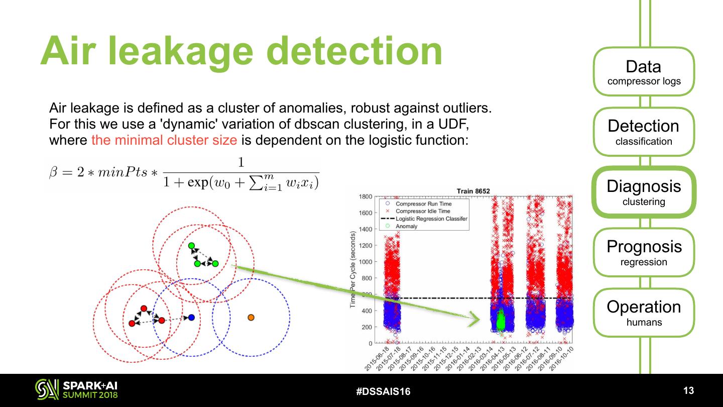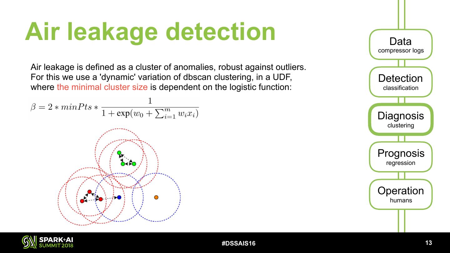 24 .Air leakage detection Data compressor logs Air leakage is defined as a cluster of anomalies, robust against outliers. For this we use a 'dynamic' variation of dbscan clustering, in a UDF, Detection where the minimal cluster size is dependent on the logistic function: classification Diagnosis clustering Prognosis regression Operation humans #DSSAIS16 !13