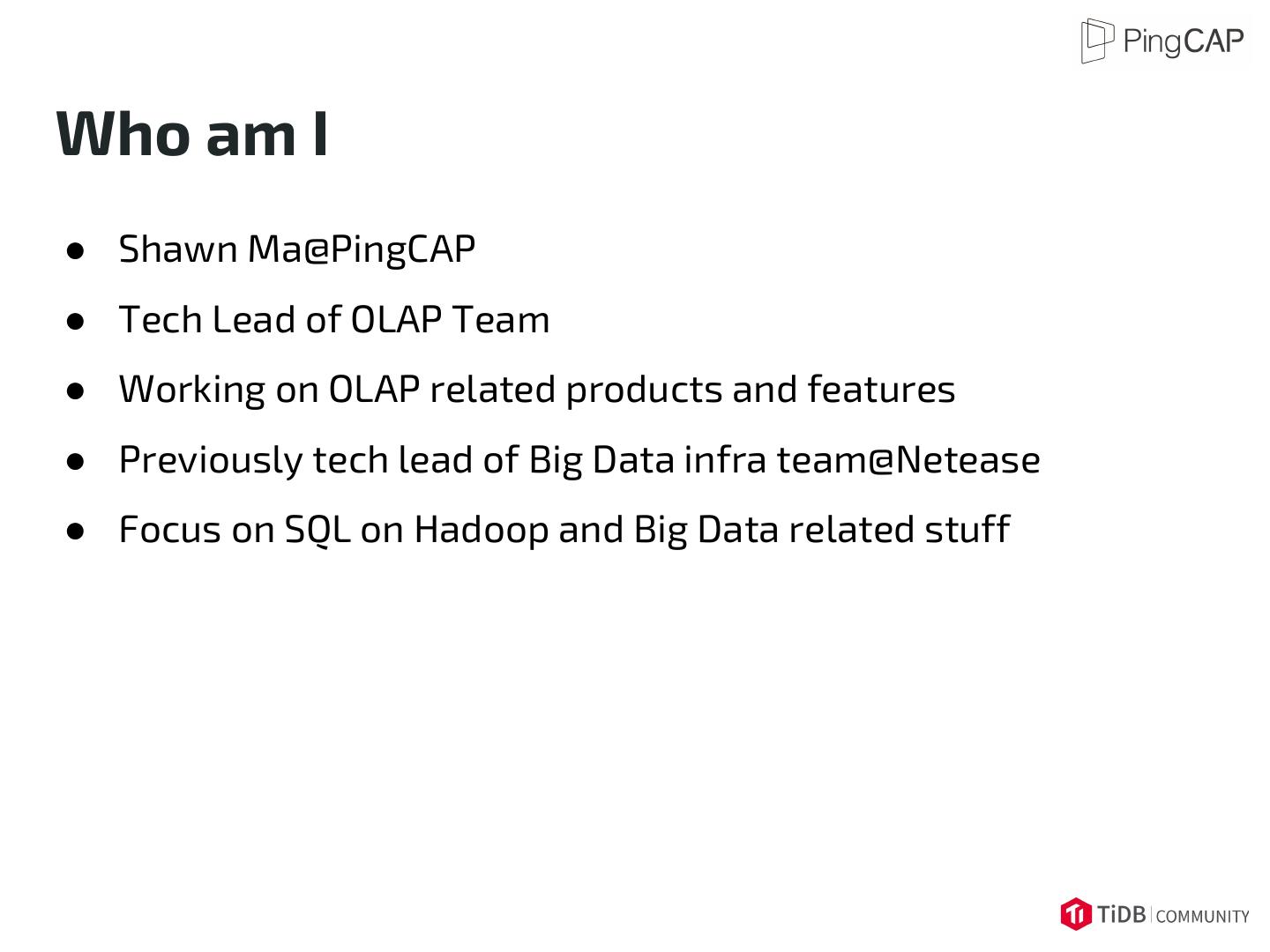 2 .Who am I ● Shawn Ma@PingCAP ● Tech Lead of OLAP Team ● Working on OLAP related products and features ● Previously tech lead of Big Data infra team@Netease ● Focus on SQL on Hadoop and Big Data related stuff