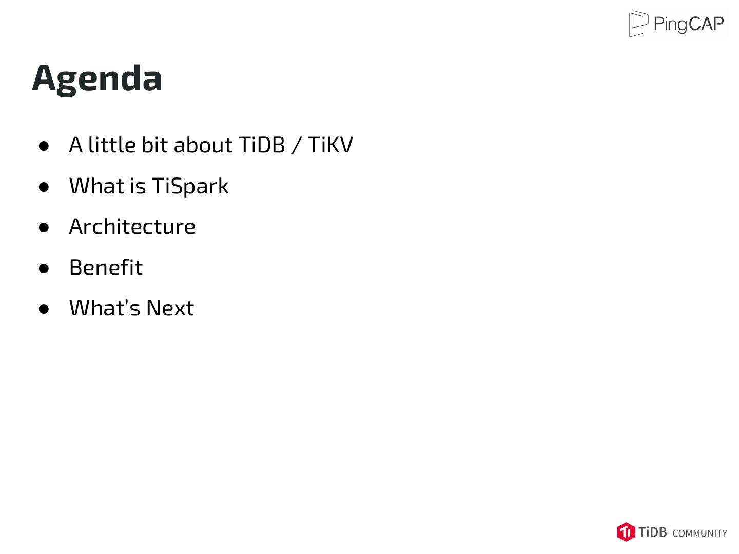 3 .Agenda ● A little bit about TiDB / TiKV ● What is TiSpark ● Architecture ● Benefit ● What’s Next
