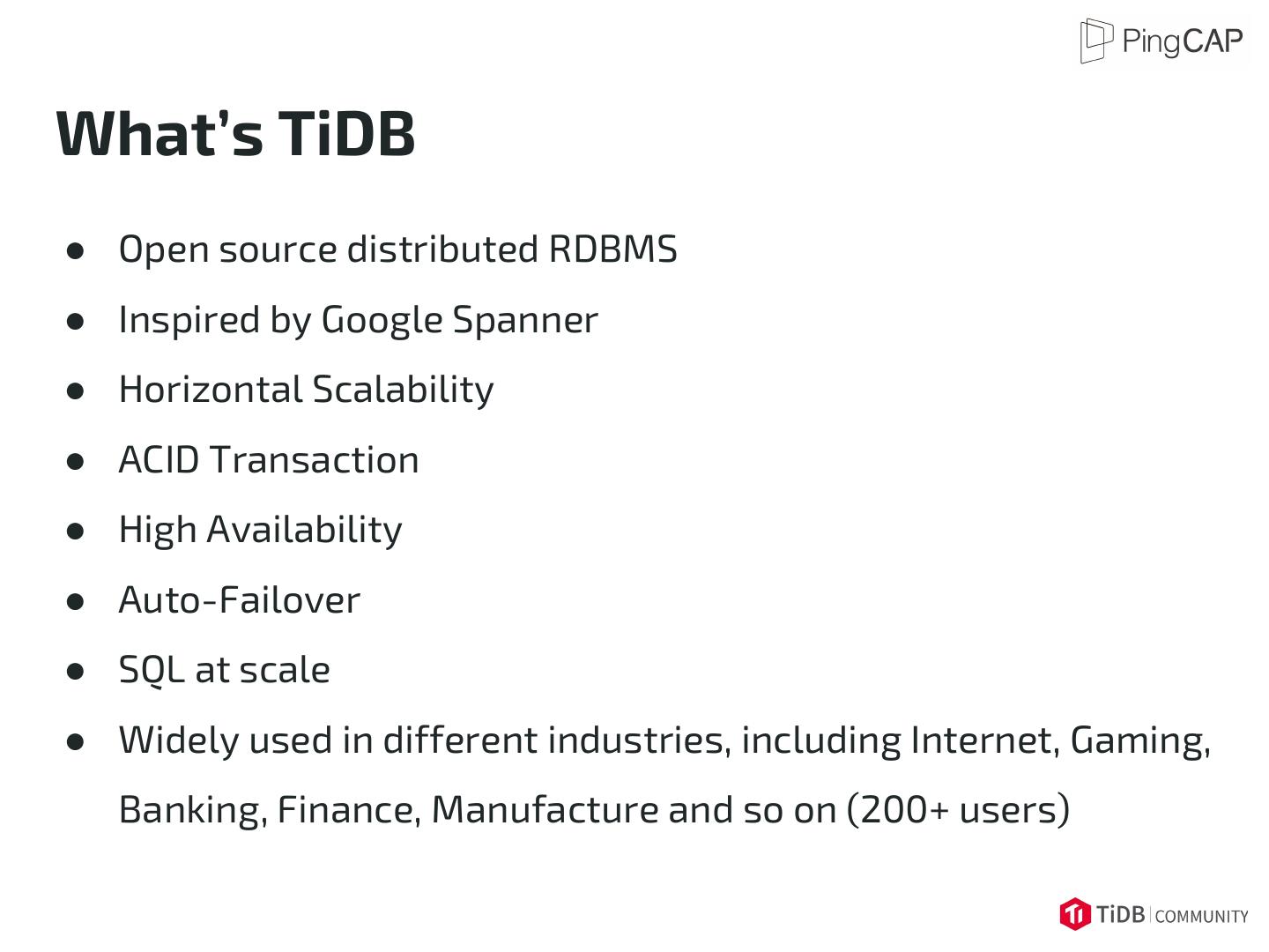4 .What’s TiDB ● Open source distributed RDBMS ● Inspired by Google Spanner ● Horizontal Scalability ● ACID Transaction ● High Availability ● Auto-Failover ● SQL at scale ● Widely used in different industries, including Internet, Gaming, Banking, Finance, Manufacture and so on (200+ users)