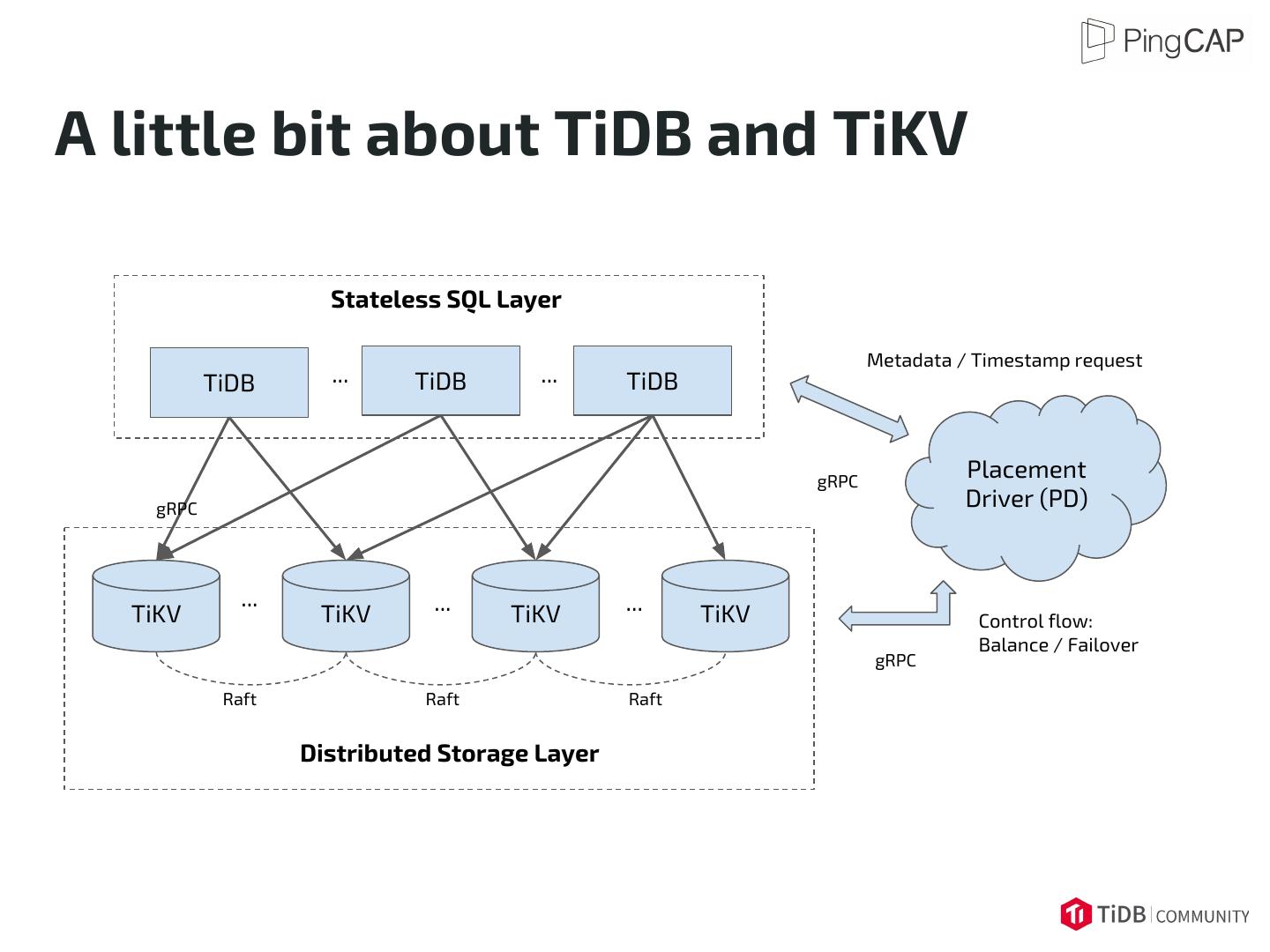 5 .A little bit about TiDB and TiKV Stateless SQL Layer Metadata / Timestamp request TiDB ... TiDB ... TiDB gRPC Placement gRPC Driver (PD) ... ... ... TiKV TiKV TiKV TiKV Control flow: Balance / Failover gRPC Raft Raft Raft Distributed Storage Layer