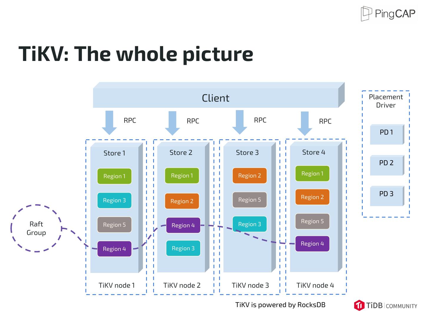 6 .TiKV: The whole picture Client Placement Driver RPC RPC RPC RPC PD 1 Store 1 Store 2 Store 3 Store 4 PD 2 Region 1 Region 1 Region 2 Region 1 Region 2 PD 3 Region 3 Region 2 Region 5 Region 5 Raft Region 5 Region 4 Region 3 Group Region 4 Region 4 Region 3 TiKV node 1 TiKV node 2 TiKV node 3 TiKV node 4 TiKV is powered by RocksDB