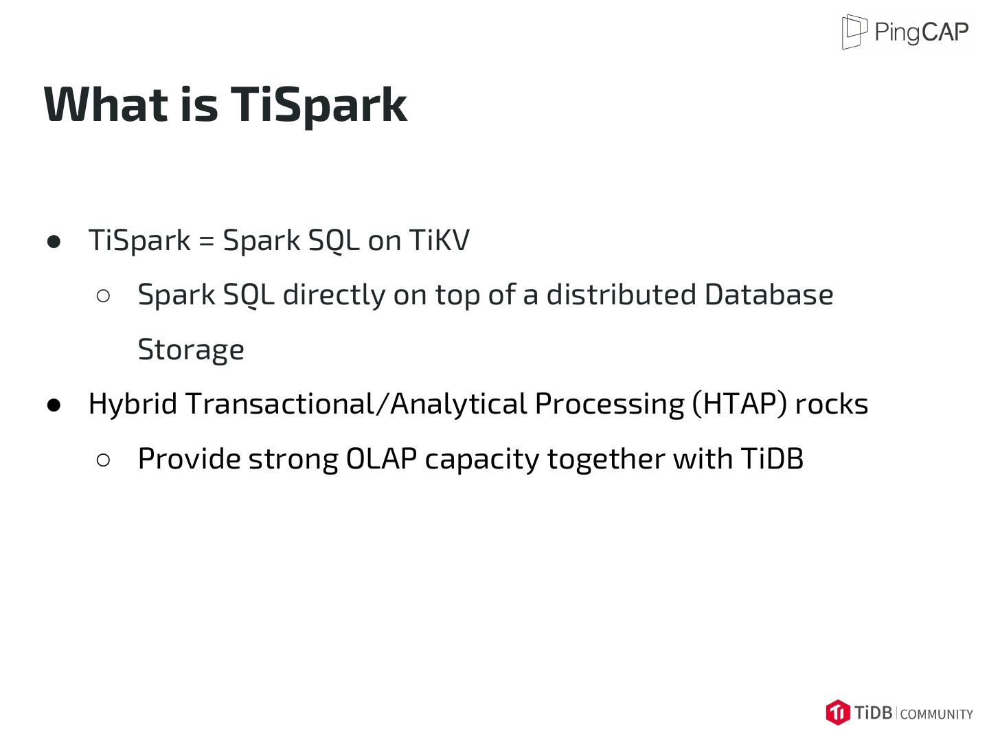 7 .What is TiSpark ● TiSpark = Spark SQL on TiKV ○ Spark SQL directly on top of a distributed Database Storage ● Hybrid Transactional/Analytical Processing (HTAP) rocks ○ Provide strong OLAP capacity together with TiDB