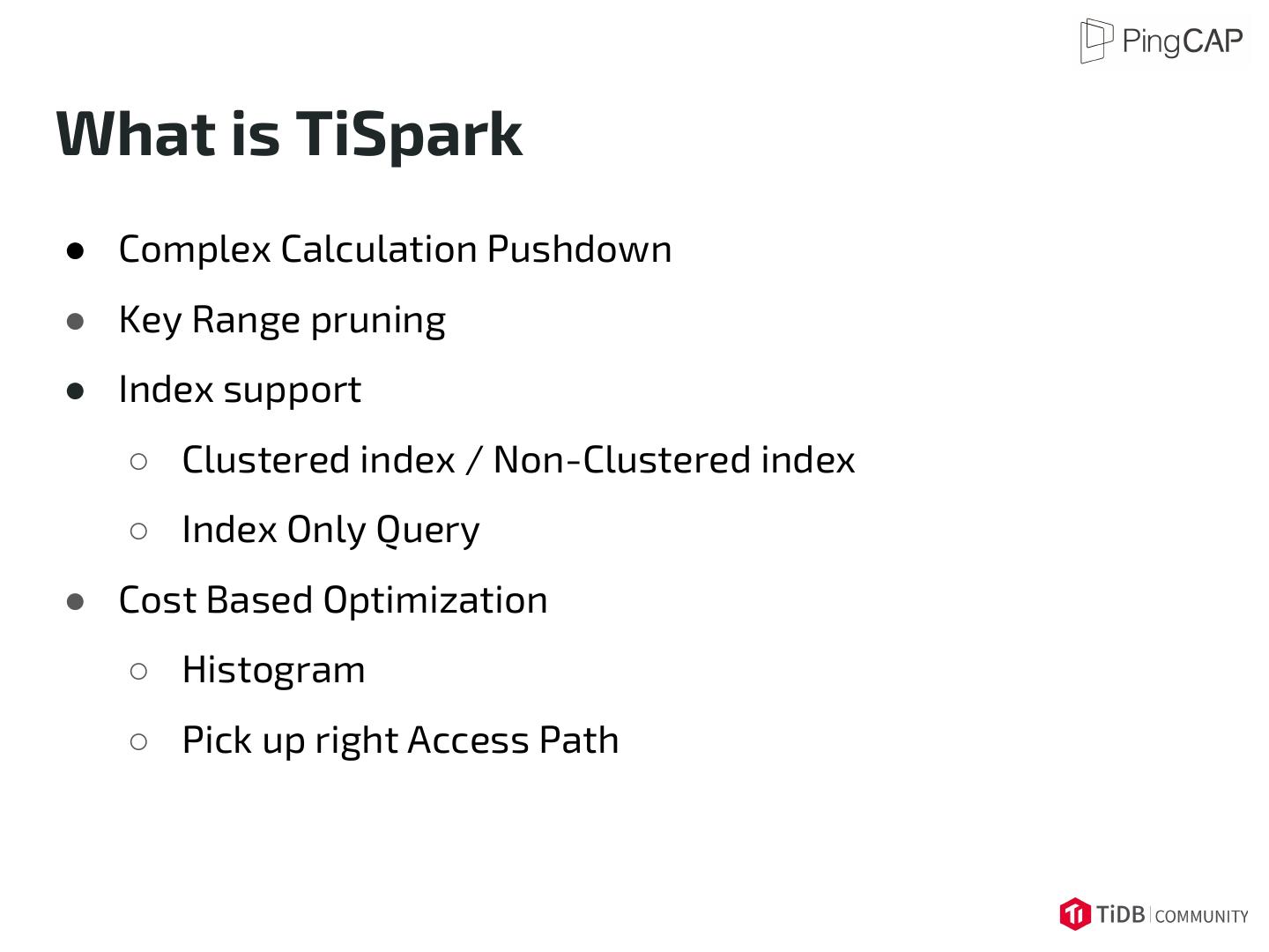 8 .What is TiSpark ● Complex Calculation Pushdown ● Key Range pruning ● Index support ○ Clustered index / Non-Clustered index ○ Index Only Query ● Cost Based Optimization ○ Histogram ○ Pick up right Access Path