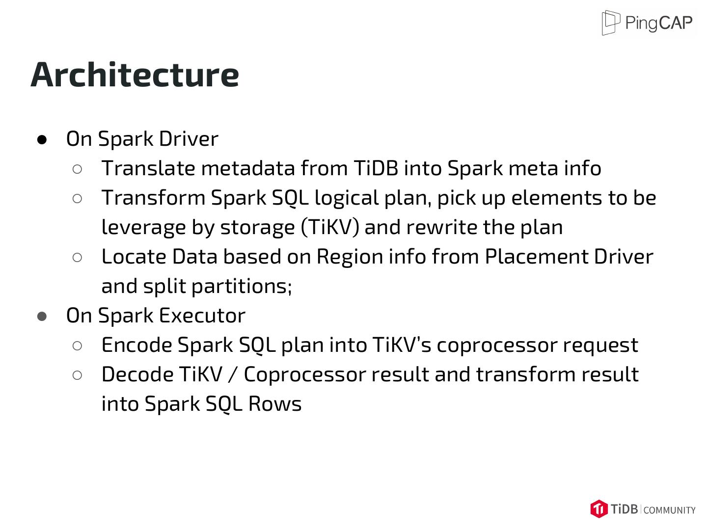 10 .Architecture ● On Spark Driver ○ Translate metadata from TiDB into Spark meta info ○ Transform Spark SQL logical plan, pick up elements to be leverage by storage (TiKV) and rewrite the plan ○ Locate Data based on Region info from Placement Driver and split partitions; ● On Spark Executor ○ Encode Spark SQL plan into TiKV’s coprocessor request ○ Decode TiKV / Coprocessor result and transform result into Spark SQL Rows