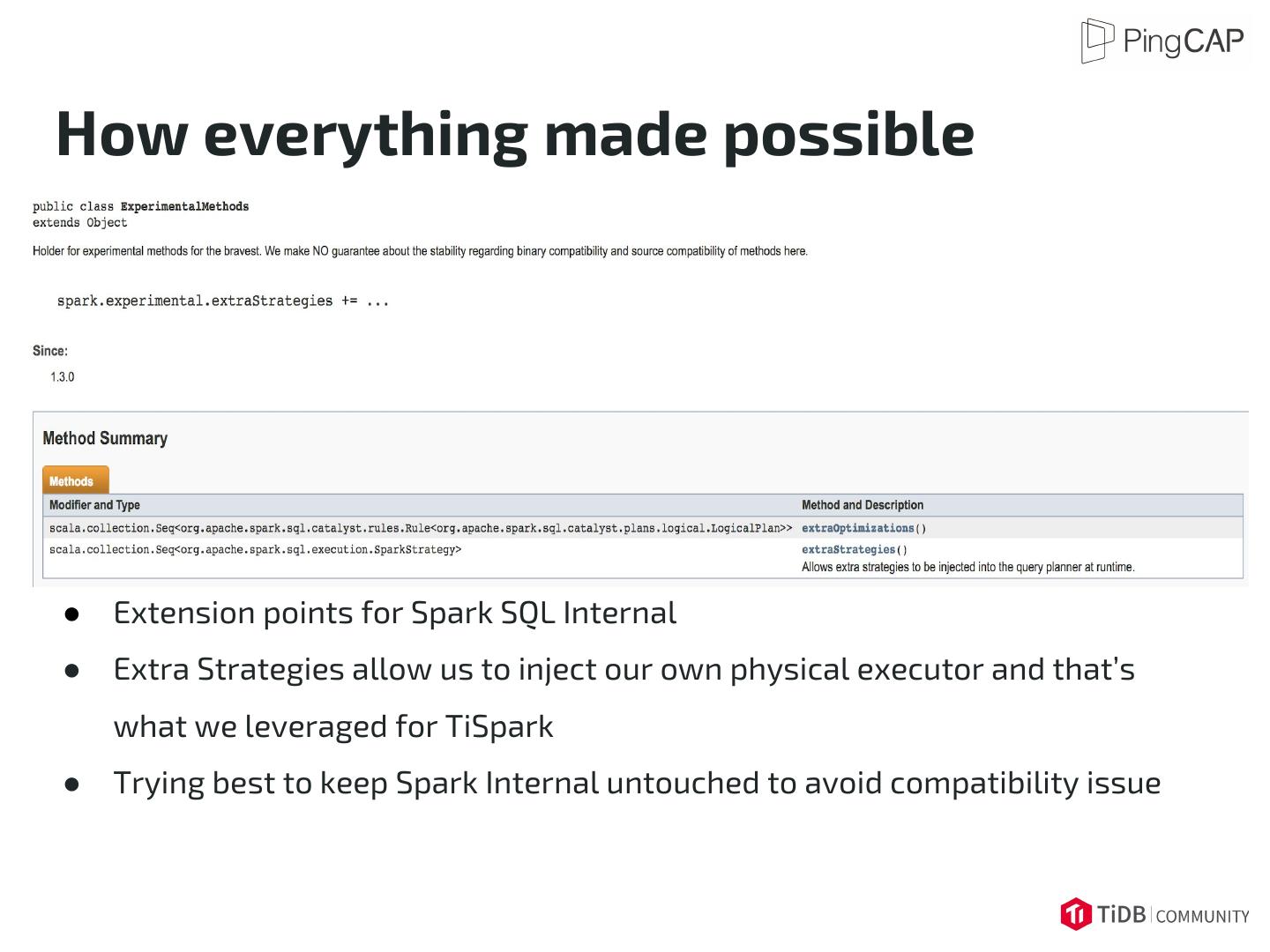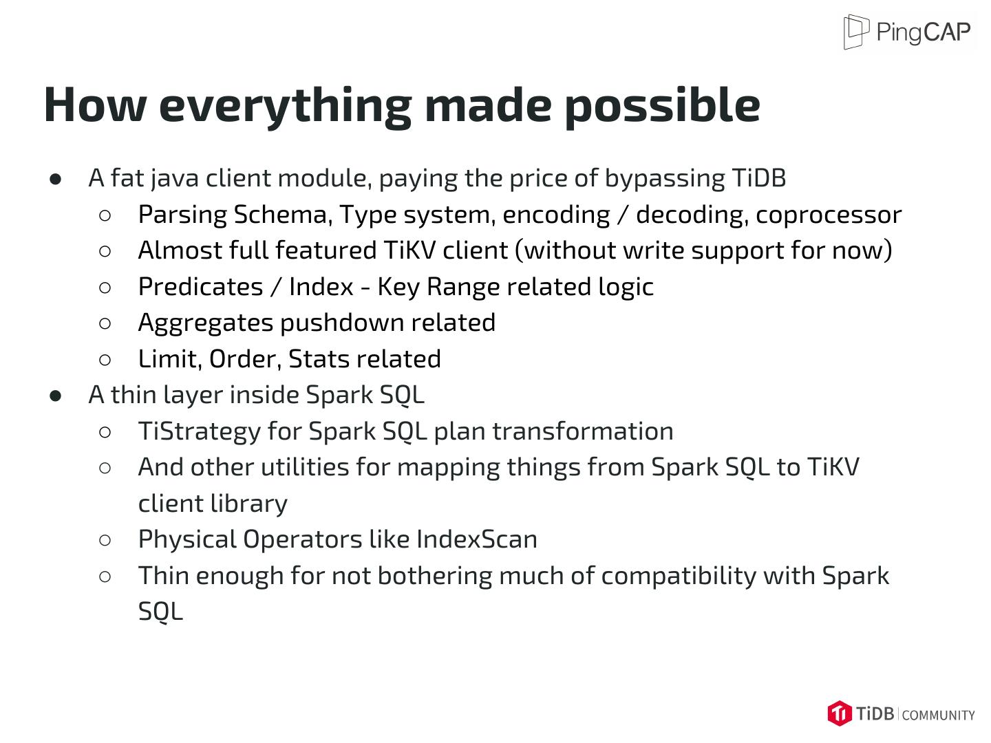 12 .How everything made possible ● A fat java client module, paying the price of bypassing TiDB ○ Parsing Schema, Type system, encoding / decoding, coprocessor ○ Almost full featured TiKV client (without write support for now) ○ Predicates / Index - Key Range related logic ○ Aggregates pushdown related ○ Limit, Order, Stats related ● A thin layer inside Spark SQL ○ TiStrategy for Spark SQL plan transformation ○ And other utilities for mapping things from Spark SQL to TiKV client library ○ Physical Operators like IndexScan ○ Thin enough for not bothering much of compatibility with Spark SQL