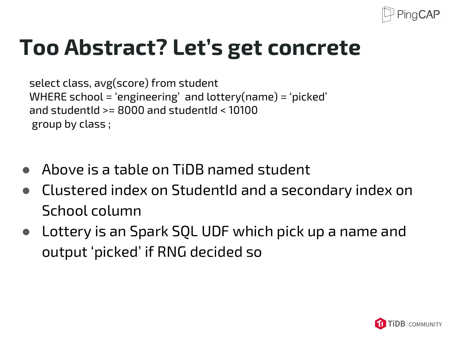 13 .Too Abstract? Let’s get concrete select class, avg(score) from student WHERE school = ‘engineering’ and lottery(name) = ‘picked’ and studentId >= 8000 and studentId < 10100 group by class ; ● Above is a table on TiDB named student ● Clustered index on StudentId and a secondary index on School column ● Lottery is an Spark SQL UDF which pick up a name and output ‘picked’ if RNG decided so