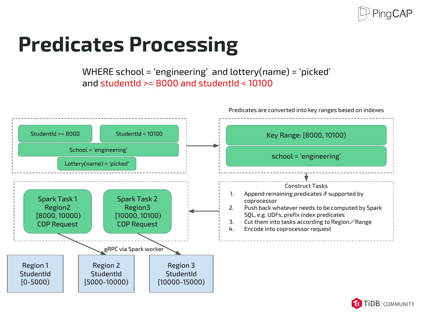 14 .Predicates Processing WHERE school = ‘engineering’ and lottery(name) = ‘picked’ and studentId >= 8000 and studentId < 10100 Predicates are converted into key ranges based on indexes StudentId >= 8000 StudentId < 10100 Key Range: [8000, 10100) School = ‘engineering’ school = ‘engineering’ Lottery(name) = ‘picked’ Construct Tasks 1. Append remaining predicates if supported by Spark Task 1 Spark Task 2 coprocessor Region2 Region3 2. Push back whatever needs to be computed by Spark [8000, 10000) [10000, 10100) SQL, e.g. UDFs, prefix index predicates COP Request COP Request 3. Cut them into tasks according to Region/Range 4. Encode into coprocessor request gRPC via Spark worker Region 1 Region 2 Region 3 StudentId StudentId StudentId [0-5000) [5000-10000) [10000-15000)