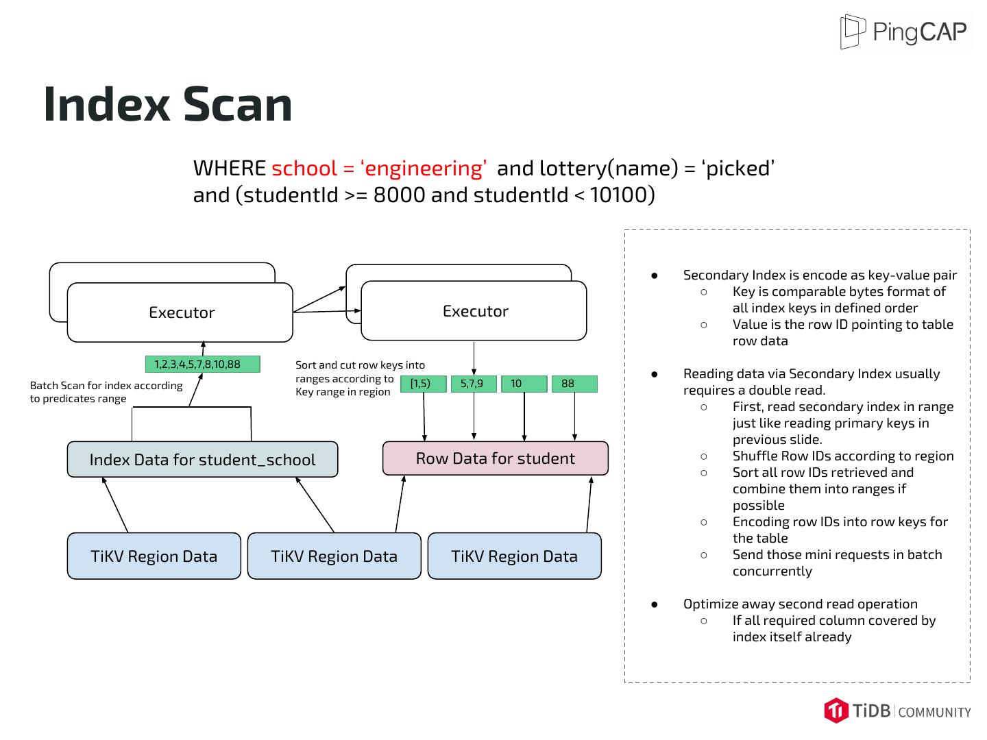 15 . Index Scan WHERE school = ‘engineering’ and lottery(name) = ‘picked’ and (studentId >= 8000 and studentId < 10100) ● Secondary Index is encode as key-value pair ○ Key is comparable bytes format of Executor Executor all index keys in defined order ○ Value is the row ID pointing to table row data 1,2,3,4,5,7,8,10,88 Sort and cut row keys into ranges according to [1,5) ● Reading data via Secondary Index usually Batch Scan for index according 5,7,9 10 88 Key range in region requires a double read. to predicates range ○ First, read secondary index in range just like reading primary keys in previous slide. Index Data for student_school Row Data for student ○ Shuffle Row IDs according to region ○ Sort all row IDs retrieved and combine them into ranges if possible ○ Encoding row IDs into row keys for the table TiKV Region Data TiKV Region Data TiKV Region Data ○ Send those mini requests in batch concurrently ● Optimize away second read operation ○ If all required column covered by index itself already