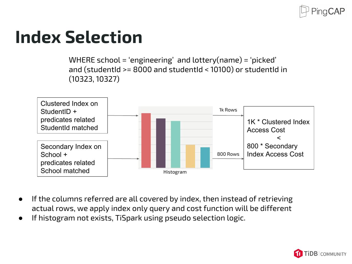 16 .Index Selection WHERE school = ‘engineering’ and lottery(name) = ‘picked’ and (studentId >= 8000 and studentId < 10100) or studentId in (10323, 10327) Clustered Index on StudentID + 1k Rows predicates related 1K * Clustered Index StudentId matched Access Cost < Secondary Index on 800 * Secondary School + 800 Rows Index Access Cost predicates related School matched Histogram ● If the columns referred are all covered by index, then instead of retrieving actual rows, we apply index only query and cost function will be different ● If histogram not exists, TiSpark using pseudo selection logic.