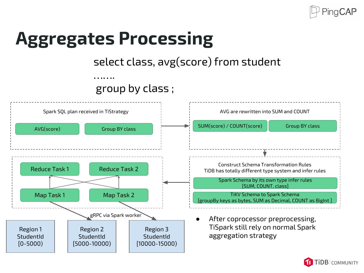 17 .Aggregates Processing select class, avg(score) from student ……. group by class ; Spark SQL plan received in TiStrategy AVG are rewritten into SUM and COUNT SUM(score) / COUNT(score) Group BY class AVG(score) Group BY class Construct Schema Transformation Rules Reduce Task 1 Reduce Task 2 TiDB has totally different type system and infer rules Spark Schema by its own type infer rules [SUM, COUNT, class] Map Task 1 Map Task 2 TiKV Schema to Spark Schema [groupBy keys as bytes, SUM as Decimal, COUNT as BigInt ] gRPC via Spark worker ● After coprocessor preprocessing, Region 1 Region 2 Region 3 TiSpark still rely on normal Spark StudentId StudentId StudentId aggregation strategy [0-5000) [5000-10000) [10000-15000)