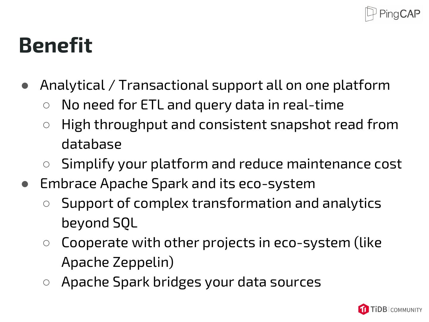 18 .Benefit ● Analytical / Transactional support all on one platform ○ No need for ETL and query data in real-time ○ High throughput and consistent snapshot read from database ○ Simplify your platform and reduce maintenance cost ● Embrace Apache Spark and its eco-system ○ Support of complex transformation and analytics beyond SQL ○ Cooperate with other projects in eco-system (like Apache Zeppelin) ○ Apache Spark bridges your data sources