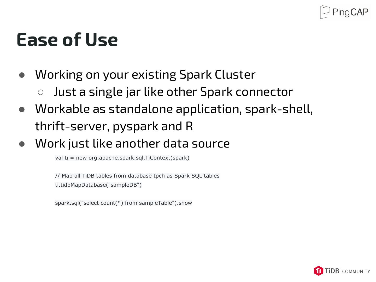 19 .Ease of Use ● Working on your existing Spark Cluster ○ Just a single jar like other Spark connector ● Workable as standalone application, spark-shell, thrift-server, pyspark and R ● Work just like another data source val ti = new org.apache.spark.sql.TiContext(spark) // Map all TiDB tables from database tpch as Spark SQL tables ti.tidbMapDatabase("sampleDB") spark.sql("select count(*) from sampleTable").show