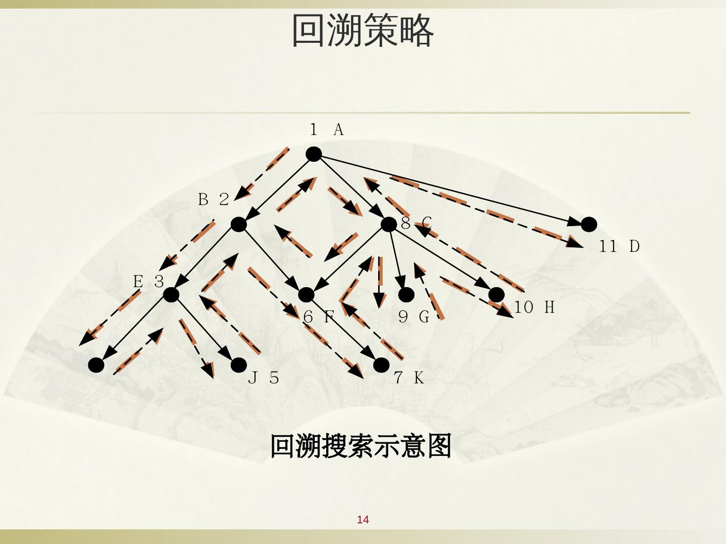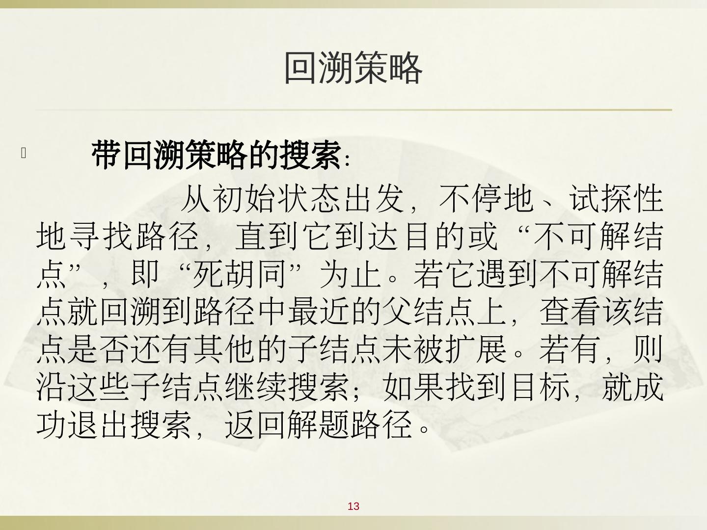 13 .13 回溯策略 带回溯策略的搜索 : 从初始状态出发,不停地、试探性地寻找路径,直到它到达目的或“不可解结点”,即“死胡同”为止。若它遇到不可解结点就回溯到路径中最近的父结点上,查看该结点是否还有其他的子结点未被扩展。若有,则沿这些子结点继续搜索;如果找到目标,就成功退出搜索,返回解题路径。