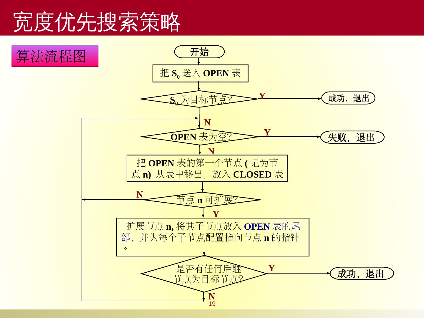 18 .18 把初始节点 S 0 放人 OPEN 表,若 S 0 为目标节点,则得到问题的解,退出; 如果 OPEN 表为空,则问题无解,退出; 把 OPEN 表的第一个节点 ( 记为节点 n) 取出放入 CLOSED 表; 考察节点 n ,若节点 n 不可扩展,则转第 Ⅱ 步; 扩展节点 n ,将其子节点放入 0PEN 表的尾部, 并为每一个子节点都配置指向父节点的指针; 如果 n 的任一个后继节点是目标节点,则找到问题的解,成功退出,否则转向第 Ⅱ 步。 宽度优先搜索 策略 基本过程