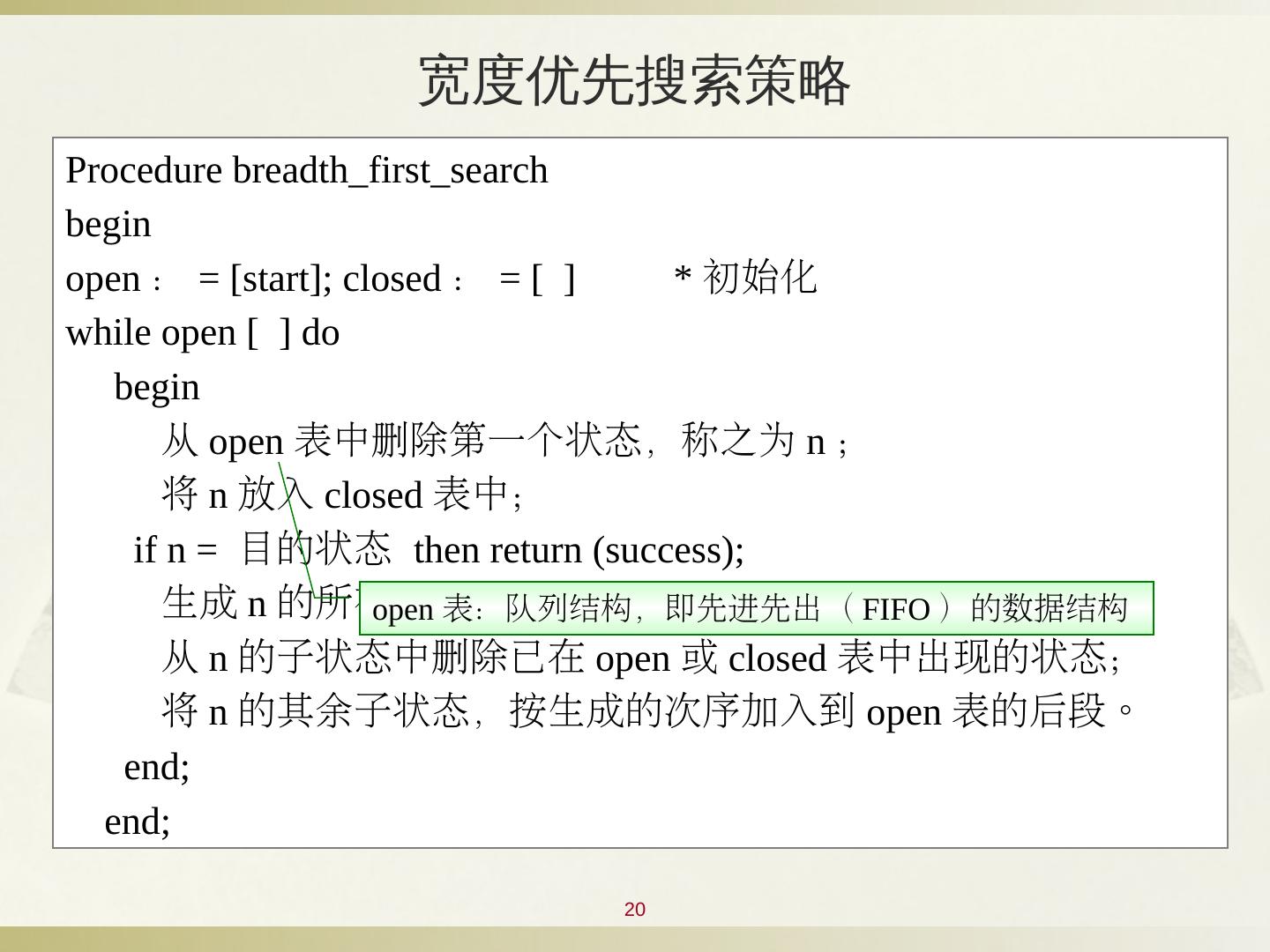 20 .20 宽度优先搜索策略 Procedure breadth_first_search begin open : = [start]; closed : = [ ] * 初始化 while open [ ] do begin 从 open 表中删除第一个状态,称之为 n ; 将 n 放入 closed 表中; if n = 目的状态 then return (success); 生成 n 的所有子状态; 从 n 的子状态中删除已在 open 或 closed 表中出现的状态; 将 n 的其余子状态,按生成的次序加入到 open 表的后段。 end; end; o pen 表:队列结构,即先进先出( FIFO )的数据结构