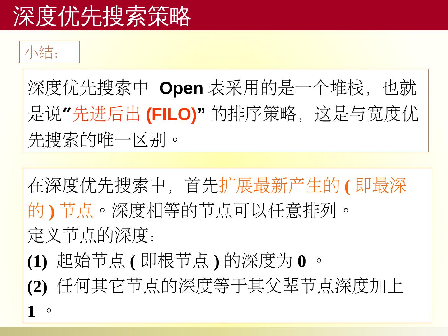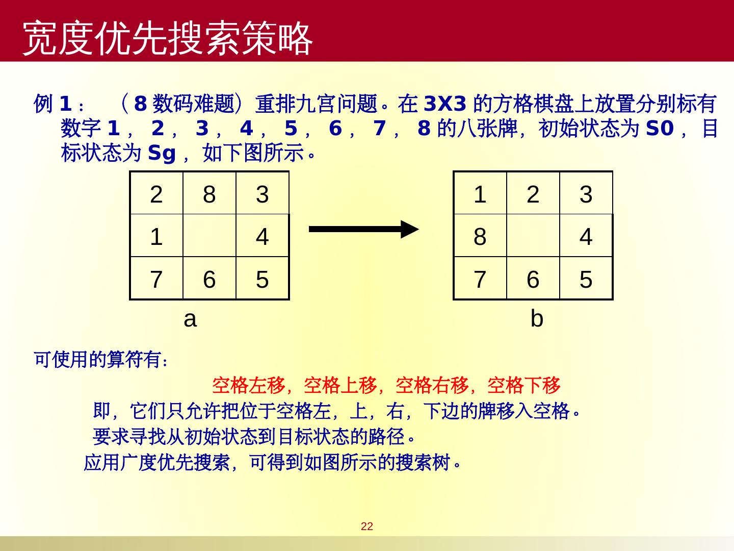 21 .21 状态节点 父节点 OPEN 表 编号 状态节点 父节点 CLOSED 表 S 0 1 2 S 0 1 2 6 3 4 5 S 0 1 2 6 3 4 5 7 8 9 (a) (b) (c) (d) S 0 S 0 1 1 2 1 2 0 0 0 3 4 2 0 3 3 5 6 7 8 9 4 1 1 1 1 2 2 3 3 4 4 5 S 0 1 0 2 0 3 1 4 1 S g (9) S 0 4 9 1 宽度优先搜索能够 保证在搜索树中找到一条通向目标节点的最短途径。 宽度优先搜索 策略 OPEN 表作为“先进先出 (FIFO)” 的队列进行操作