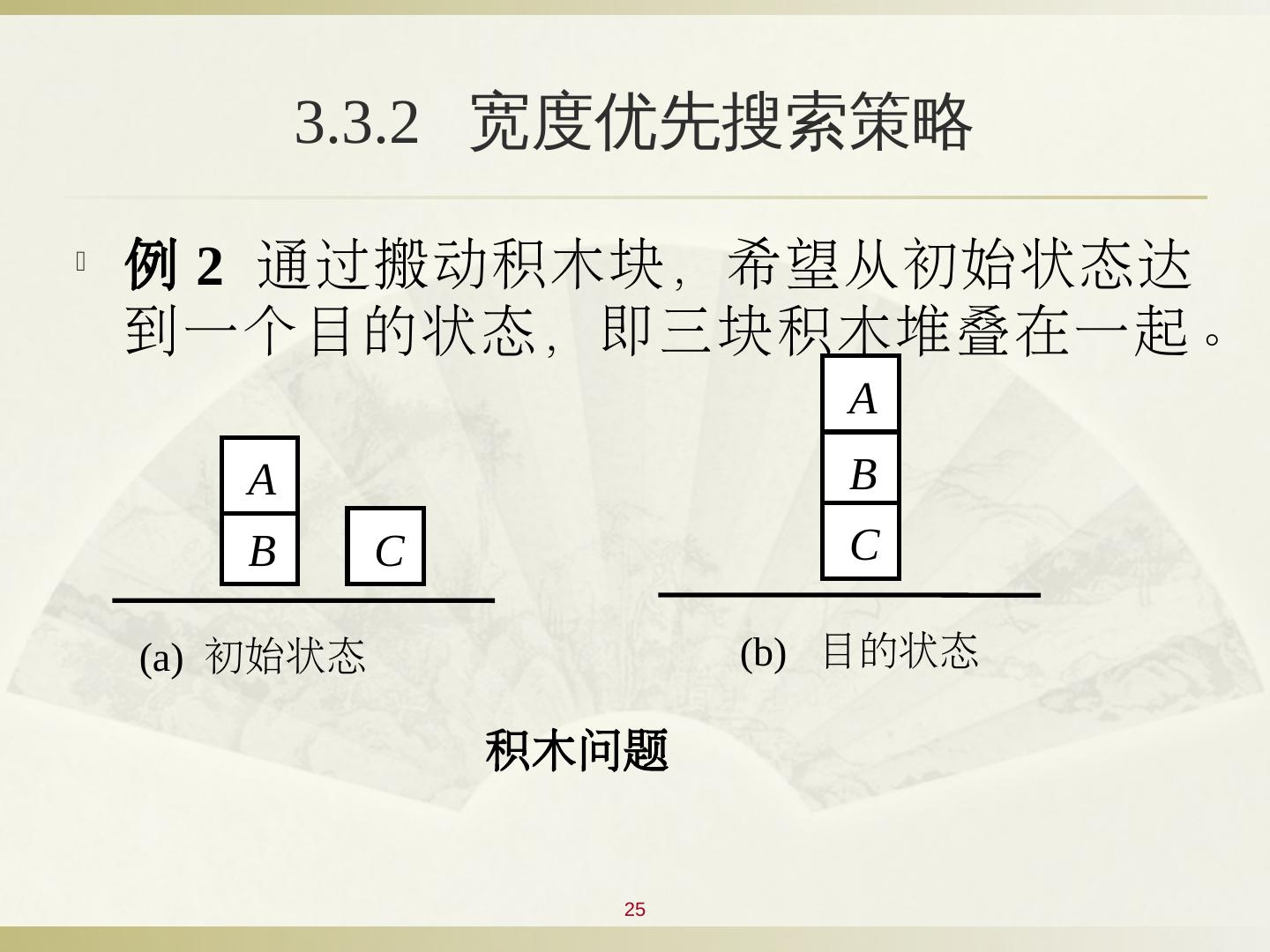 25 .25 例 2 通过搬动积木块,希望从初始状态达到一个目的状态,即三块积木堆叠在一起。 3.3.2 宽度优先搜索策略 B C A A B C (a) 初始状态 (b) 目的状态 积木问题