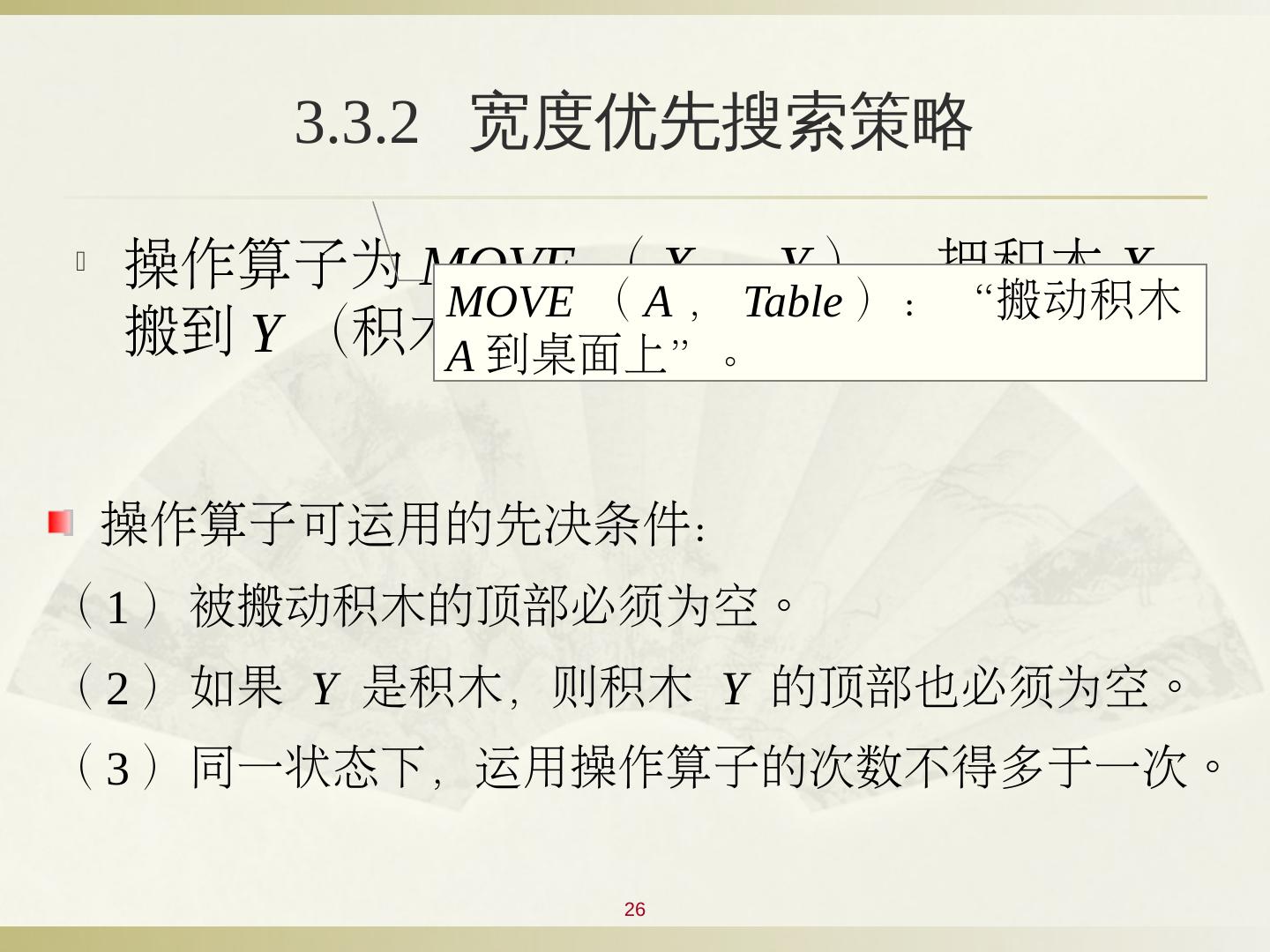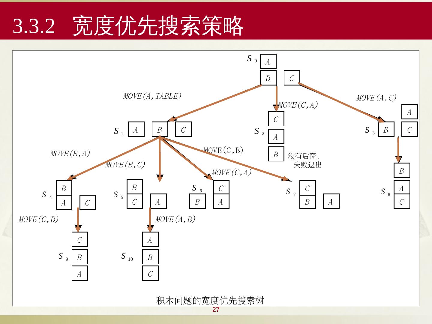 26 .26 操作算子为 MOVE ( X , Y ):把积木 X 搬到 Y (积木或桌面)上面。 3.3.2 宽度优先搜索策略 MOVE ( A , Table ):“搬动积木 A 到桌面上”。 操作算子可运用的先决条件: ( 1 )被搬动积木的顶部必须为空。 ( 2 )如果 Y 是积木,则积木 Y 的顶部也必须为空。 ( 3 )同一状态下,运用操作算子的次数不得多于一次。