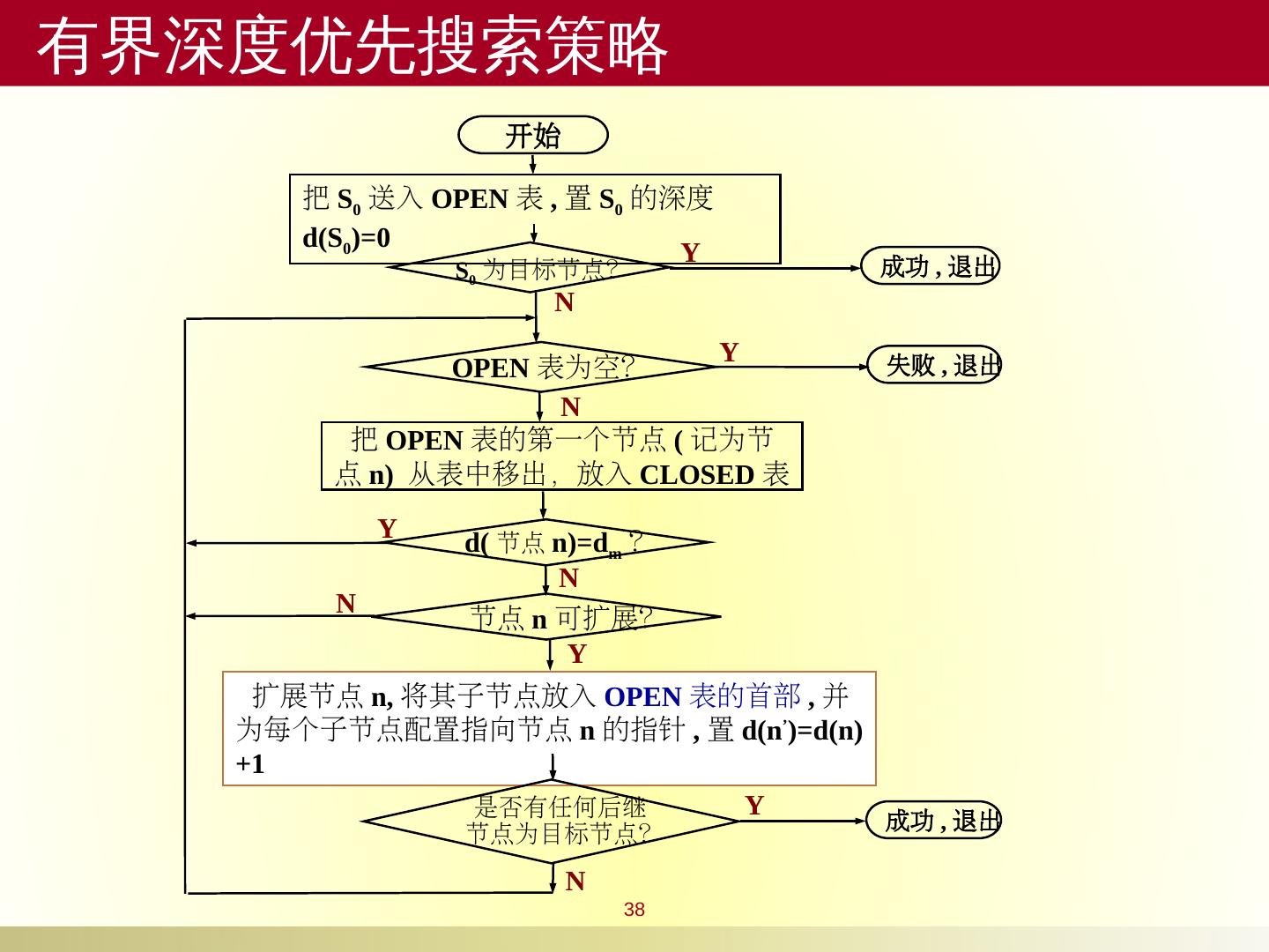 19 .19 开始 把 S 0 送入 OPEN 表 把 OPEN 表的第一个节点 ( 记为节点 n) 从表中移出,放入 CLOSED 表 OPEN 表为空? 扩展节点 n, 将其子节点放入 OPEN 表的尾部 ,并为每个子节点配置指向节点 n 的指针。 是否有任何后继 节点为目标节点? 节点 n 可扩展? 失败,退出 成功,退出 Y N Y N Y N S 0 为目标节点? 成功,退出 Y N 算法流程图 宽度优先搜索 策略