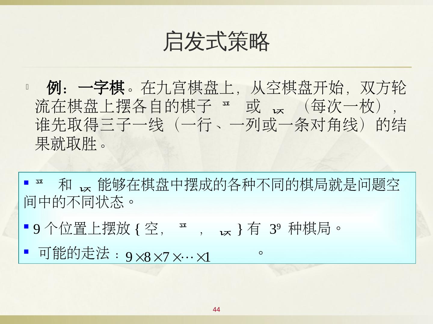 4 .4 状态空间表示法 状态 :表示系统状态、事实等叙述型知识的一组变量或数组: 操作 :表示引起状态变化的过程型知识的一组关 系或函数: T