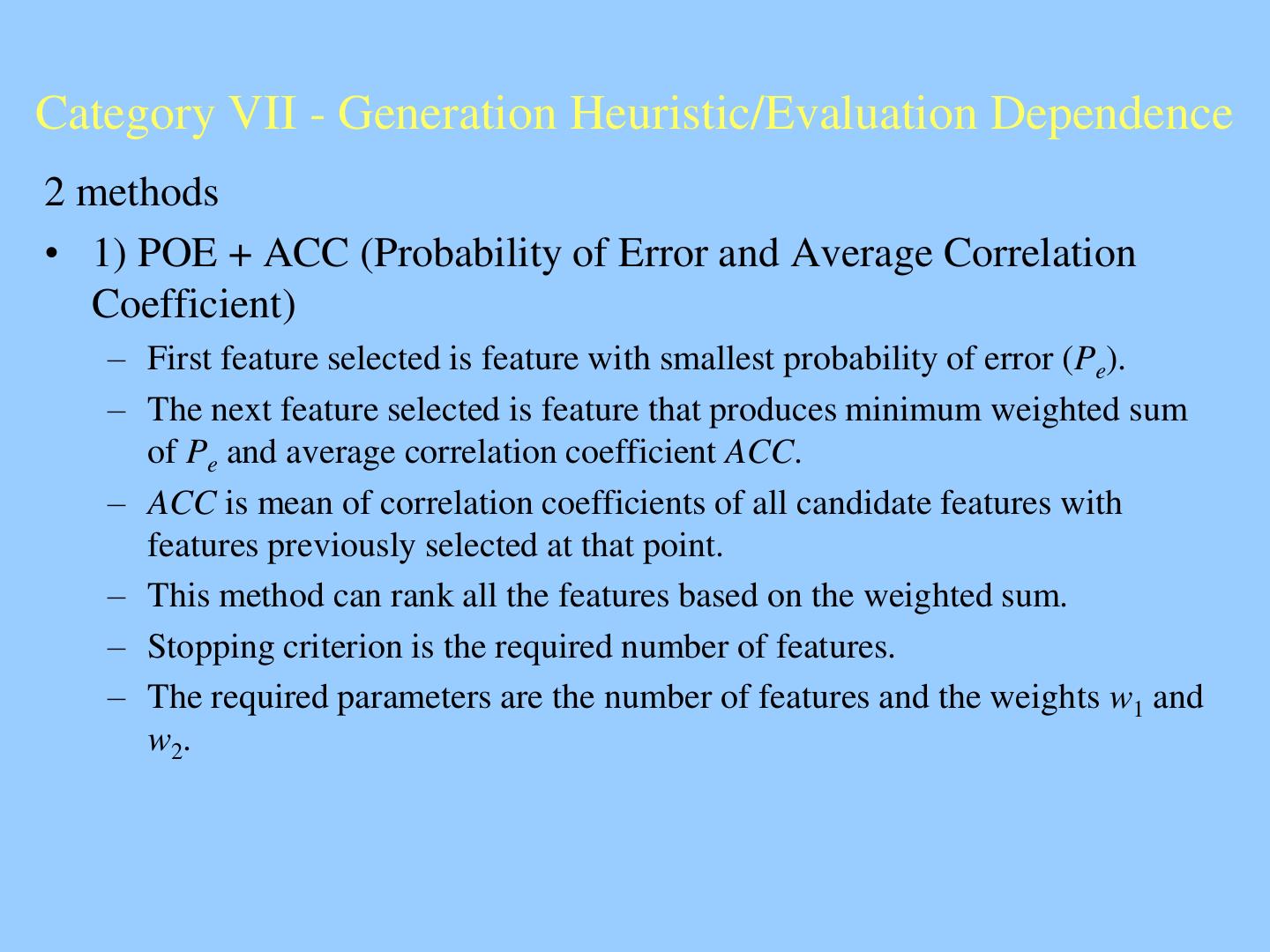 29 .Category IV - Generation Heuristic / Evaluation Information 2 Methods: • 1) Decision Tree Method (DTM) – Run C4.5 over training set. – The features that are selected are the union of all features in the pruned decision tree produced by C4.5. – An information based function selects the feature at each node of the decision tree