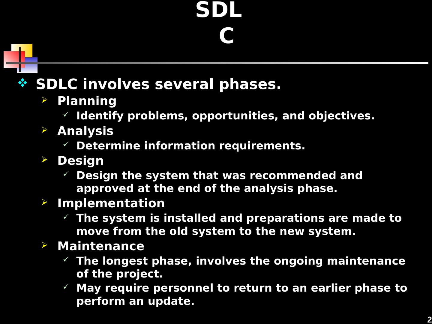 2 .2 SDLC SDLC involves several phases. Planning Identify problems, opportunities, and objectives. Analysis Determine information requirements. Design Design the system that was recommended and approved at the end of the analysis phase. Implementation The system is installed and preparations are made to move from the old system to the new system. Maintenance The longest phase, involves the ongoing maintenance of the project. May require personnel to return to an earlier phase to perform an update.