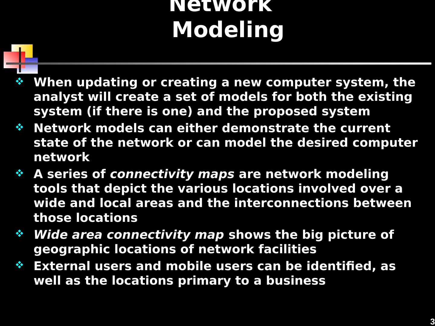3 .3 Network Modeling When updating or creating a new computer system, the analyst will create a set of models for both the existing system (if there is one) and the proposed system Network models can either demonstrate the current state of the network or can model the desired computer network A series of connectivity maps are network modeling tools that depict the various locations involved over a wide and local areas and the interconnections between those locations Wide area connectivity map shows the big picture of geographic locations of network facilities External users and mobile users can be identified, as well as the locations primary to a business