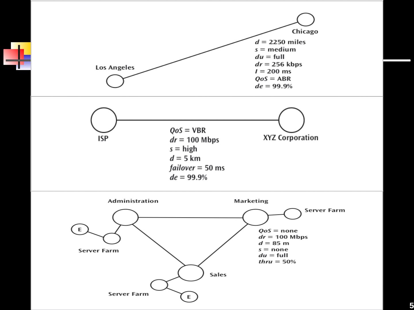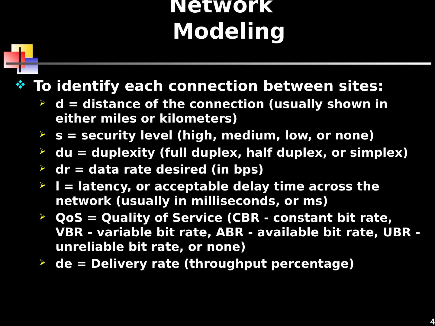4 .4 To identify each connection between sites: d = distance of the connection (usually shown in either miles or kilometers) s = security level (high, medium, low, or none) du = duplexity (full duplex, half duplex, or simplex) dr = data rate desired (in bps) l = latency, or acceptable delay time across the network (usually in milliseconds, or ms) QoS = Quality of Service (CBR - constant bit rate, VBR - variable bit rate, ABR - available bit rate, UBR - unreliable bit rate, or none) de = Delivery rate (throughput percentage) Network Modeling