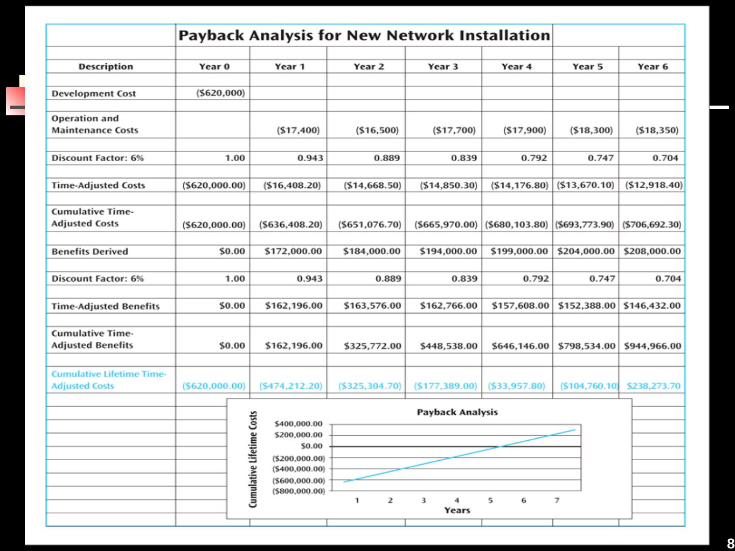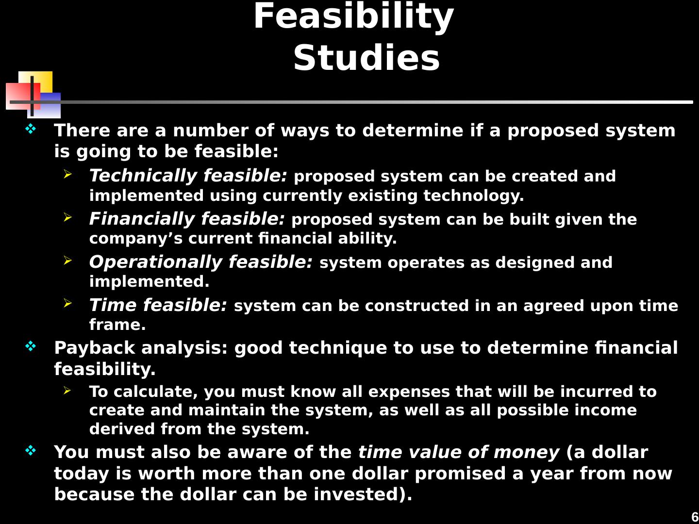 6 .6 There are a number of ways to determine if a proposed system is going to be feasible: Technically feasible: proposed system can be created and implemented using currently existing technology. Financially feasible: proposed system can be built given the company’s current financial ability. Operationally feasible: system operates as designed and implemented. Time feasible: system can be constructed in an agreed upon time frame. Payback analysis: good technique to use to determine financial feasibility. To calculate, you must know all expenses that will be incurred to create and maintain the system, as well as all possible income derived from the system. You must also be aware of the time value of money (a dollar today is worth more than one dollar promised a year from now because the dollar can be invested). Feasibility Studies