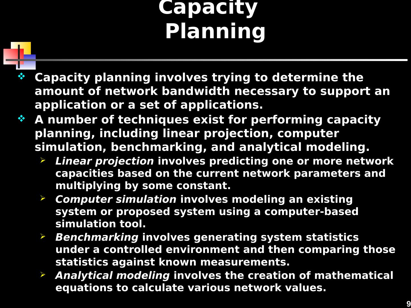 9 .9 Capacity planning involves trying to determine the amount of network bandwidth necessary to support an application or a set of applications. A number of techniques exist for performing capacity planning, including linear projection, computer simulation, benchmarking, and analytical modeling. Linear projection involves predicting one or more network capacities based on the current network parameters and multiplying by some constant. Computer simulation involves modeling an existing system or proposed system using a computer-based simulation tool. Benchmarking involves generating system statistics under a controlled environment and then comparing those statistics against known measurements. Analytical modeling involves the creation of mathematical equations to calculate various network values. Capacity Planning